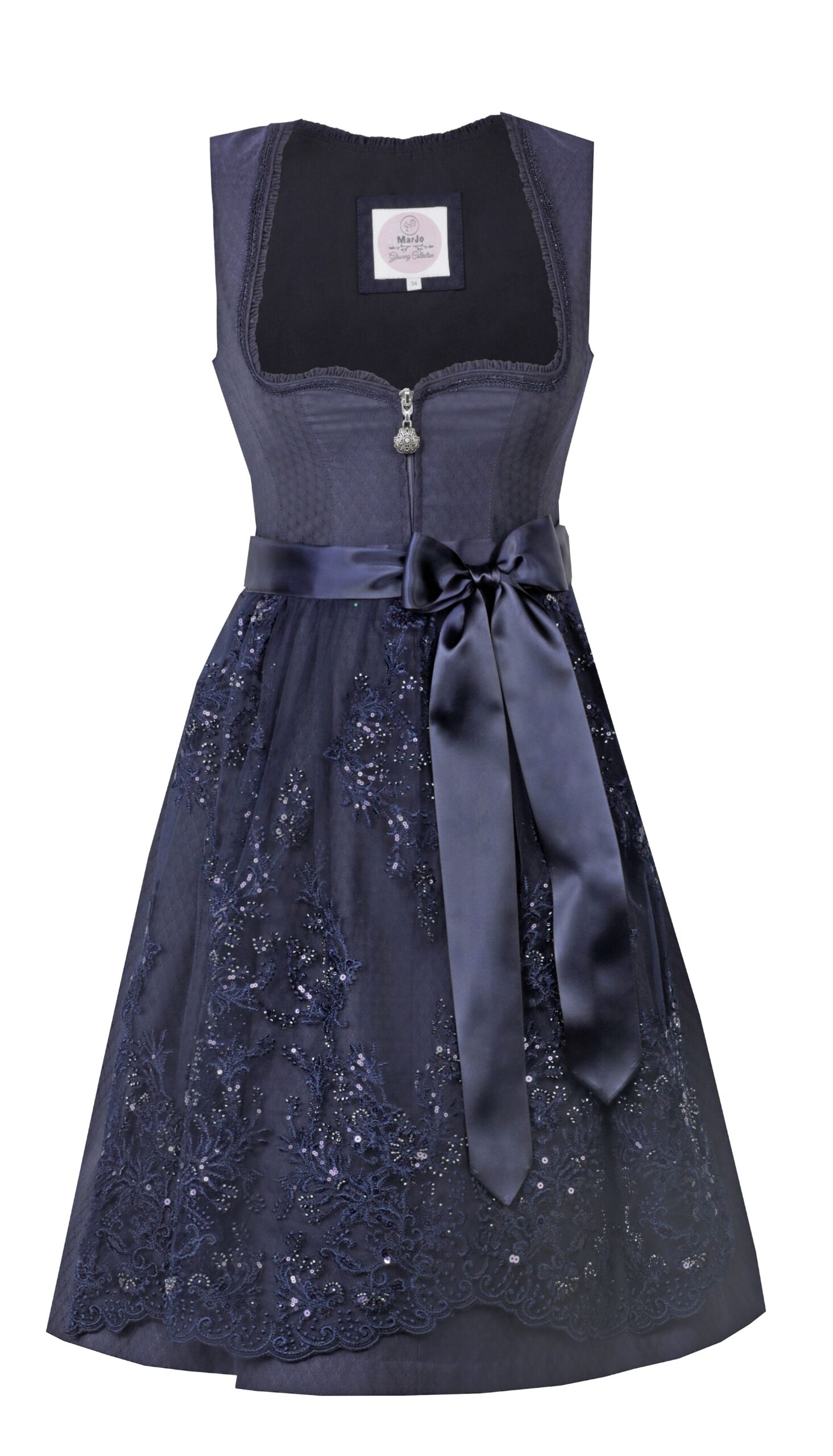 Beautiful navy brocade dress with front zip and modified sweetheart neckline trimmed with fabric ruffle and navy flat braid.ย Decorative zipper pull with rhinestone accent.ย Both the bodice and the skirt are brocade in an allover tiny palm leaf pattern with a slight sheen as light catches it from different angles.ย The gorgeous unlined lace apron in a floral bouquet pattern is decorated with navy sequins and pearls and features a shaped hemline for added interest; ties are satin ribbon.