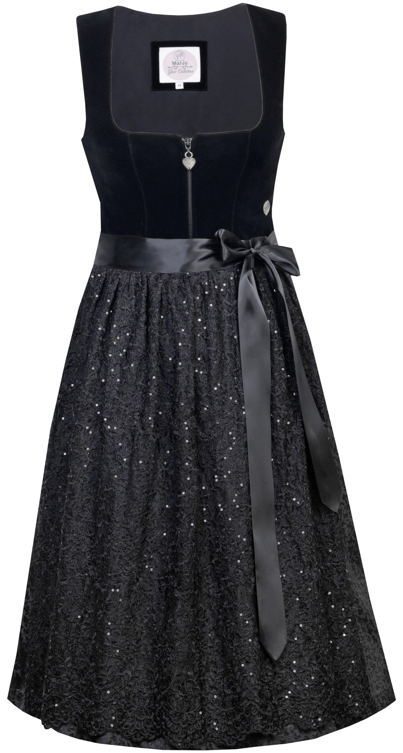 Another classic black dress features velvet zip-front bodice with fully-lined crepe brocade skirt with allover leaf design that has a slight sheen.ย Gorgeous lace apron with satin ties, sculptured hem and scattered sequins adds to the formal appeal of this dress.ย Two pockets with invisible zip closure are a practical addition.