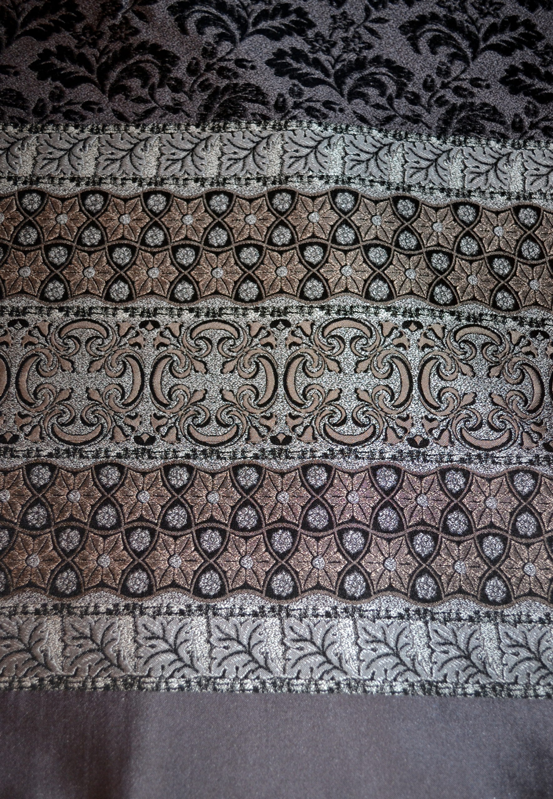 Fabulous poly brocade panel in black with shades of grey, taupe and cream. Overall pattern of flowers and foliage in black on grey, gorgeous geometric border in creamy platinum, warm taupe and grey.