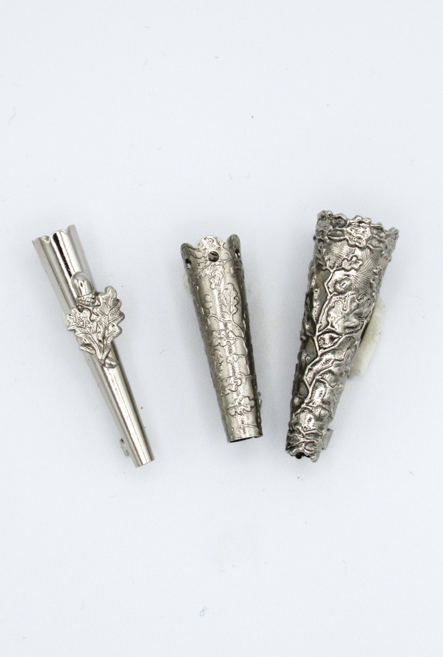 Nicely detailed feather holders to attach feathers to your favourite hat.ย  Brooch type pin keeps it securely in place.