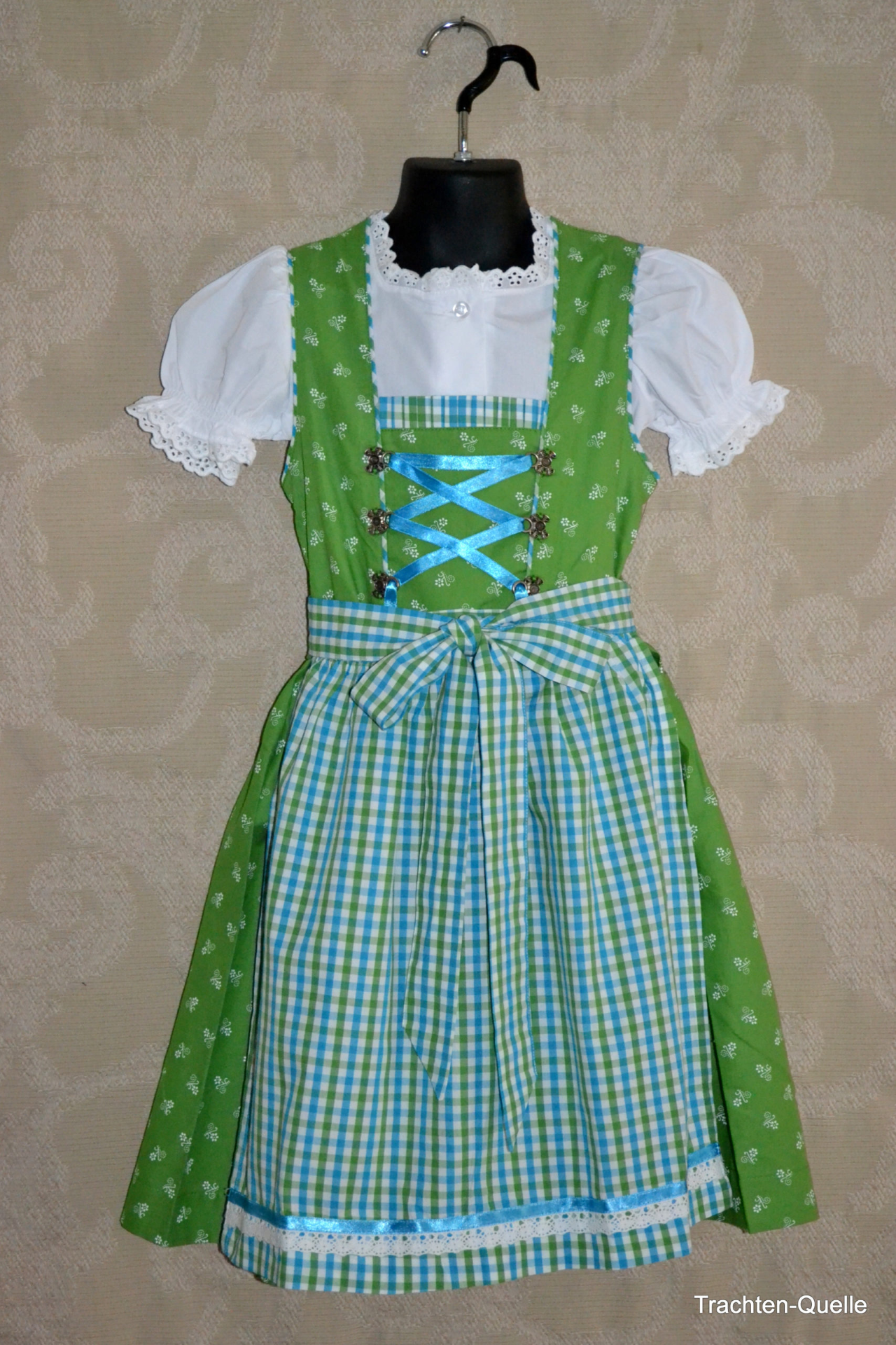 Adorable girl’s dress in a pretty spring green and white print, with white, green and turquoise gingham trim and apron. Dress has pewter finish hooks and satin ribbon up the front bodice. Back zipper closure.ย  Button-front blouse is white cotton trimmed at sleeves and neckline with pretty eyelet lace.