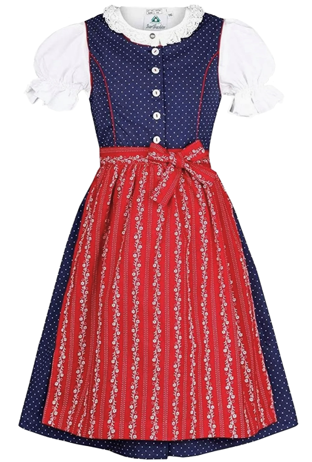 Traditional colour combination, the navy button front dress has allover white tiny polka dot pattern, the apron is red with vertical white vines and flowers print.ย White blouse shown is included.