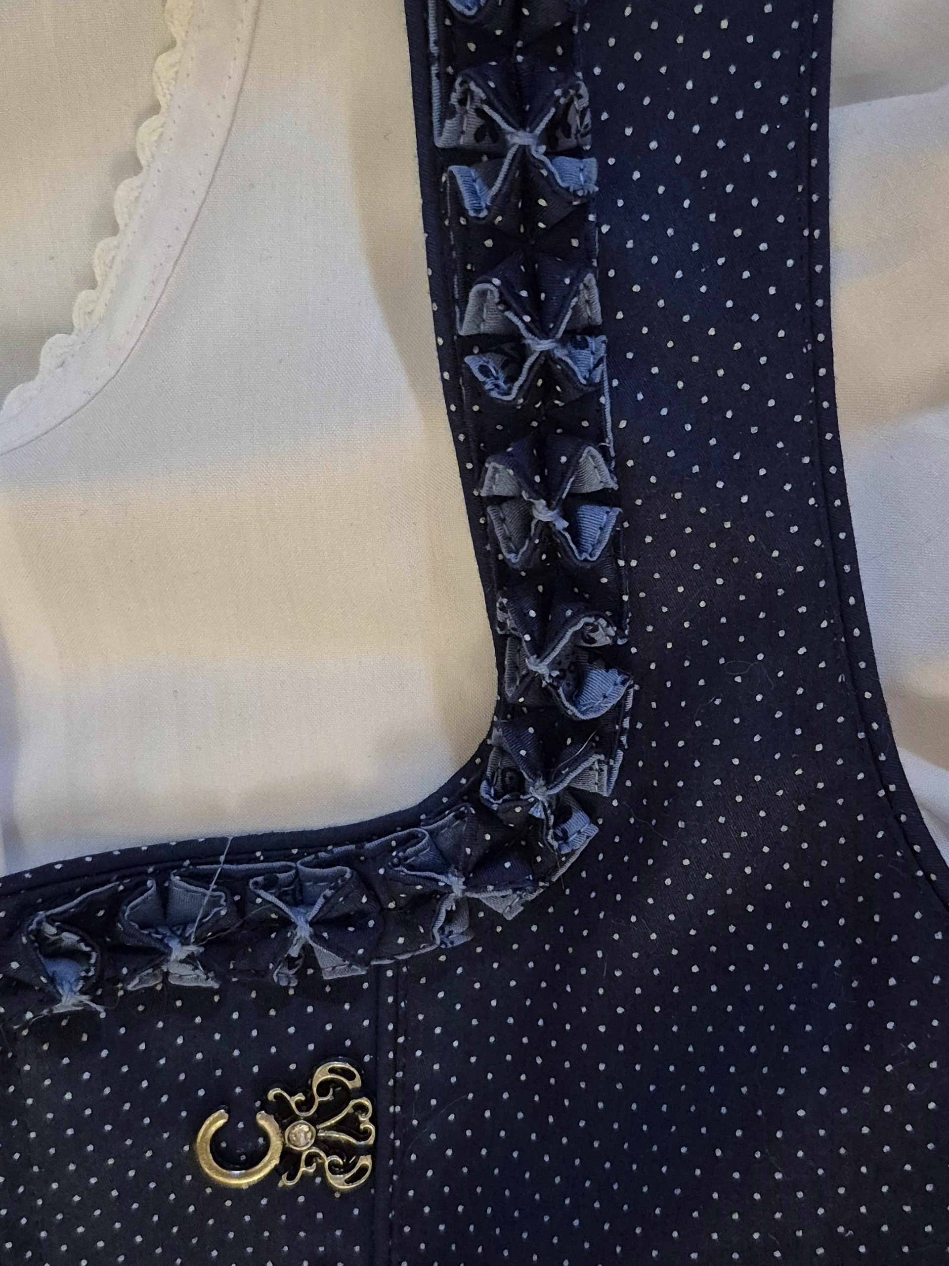 Cute micro-dot print dress in white on navy, features front lacing hooks with rhinestone, and traditional pleated trim around the neckline.ย  Apron is denim blue with vertical navy floral print stripes.ย  ย This dress is approximately mid-calf length.
