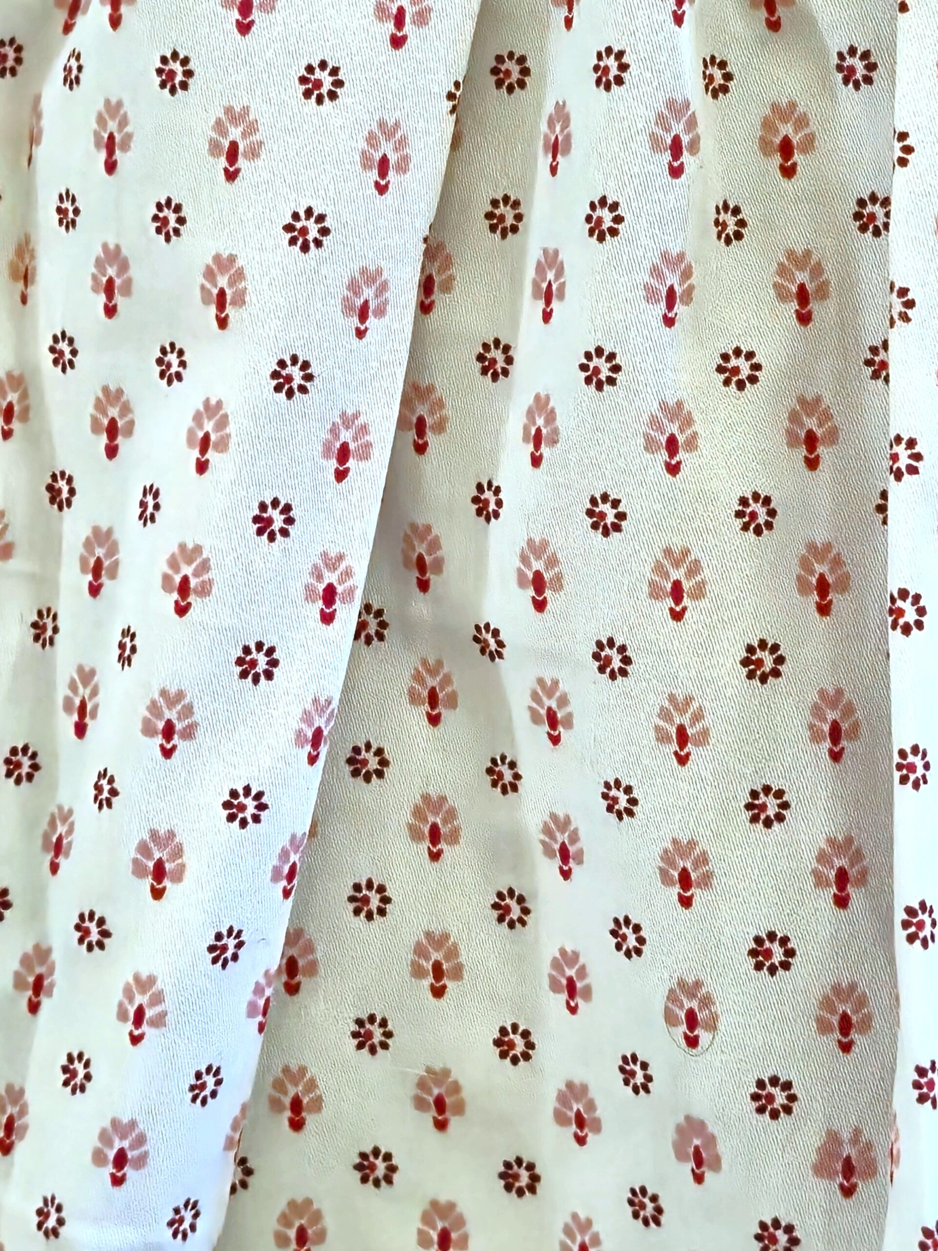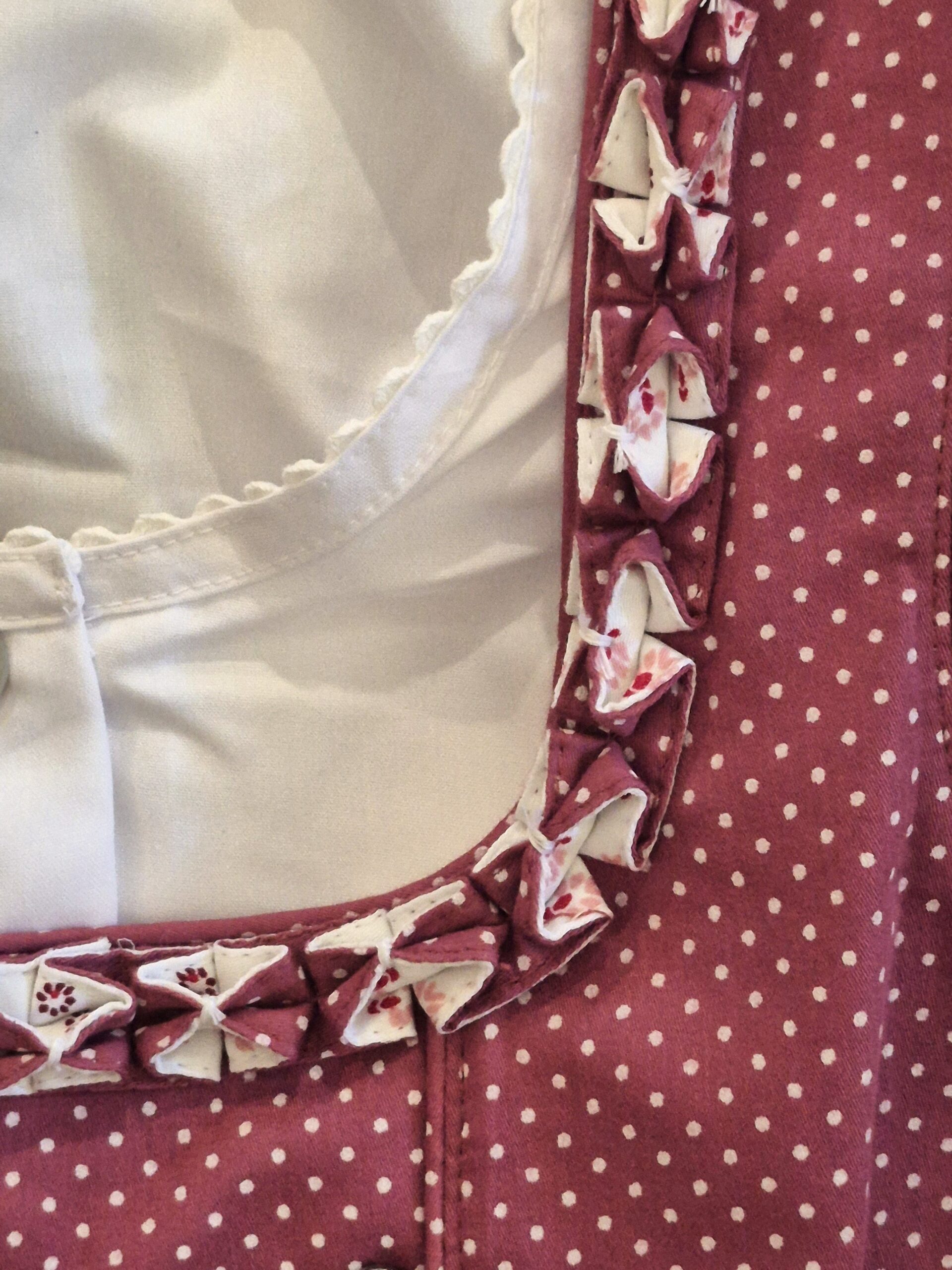 Sweet little zip-front dress in rose pink cotton with allover tiny white polka dots features traditional butterfly-pleated trim around the neckline and silver toned hooks with rhinestone accent.ย ย Apron is soft cream cotton with dainty print in shades of rose and burgundy.ย White blouse included, has short gathered sleeves and a round neckline with button front.ย Skirt portion measures approximatley 49 cm/19 inches from waist to hem.