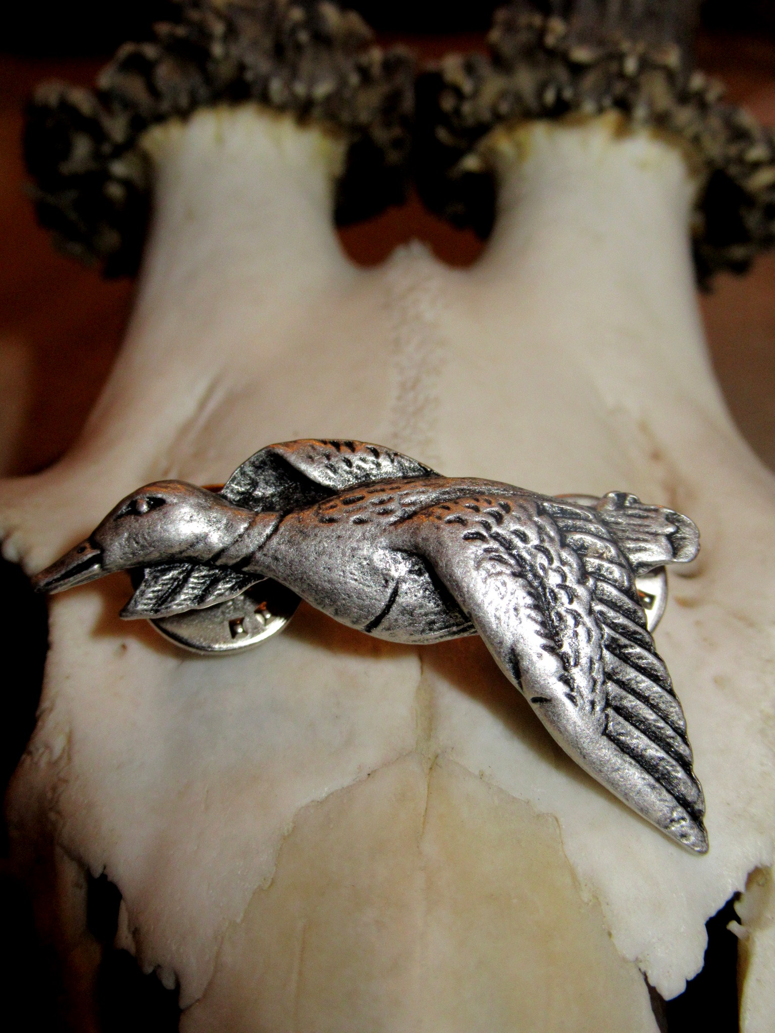 Perfect for the hunter or outdoorsperson, this nicely detailed mallard duck pin measures about 1.25 inches/30 cm wide. Antique pewter finish with two extra long clutch pins on the back to hold it securely in place on clothing or hat.