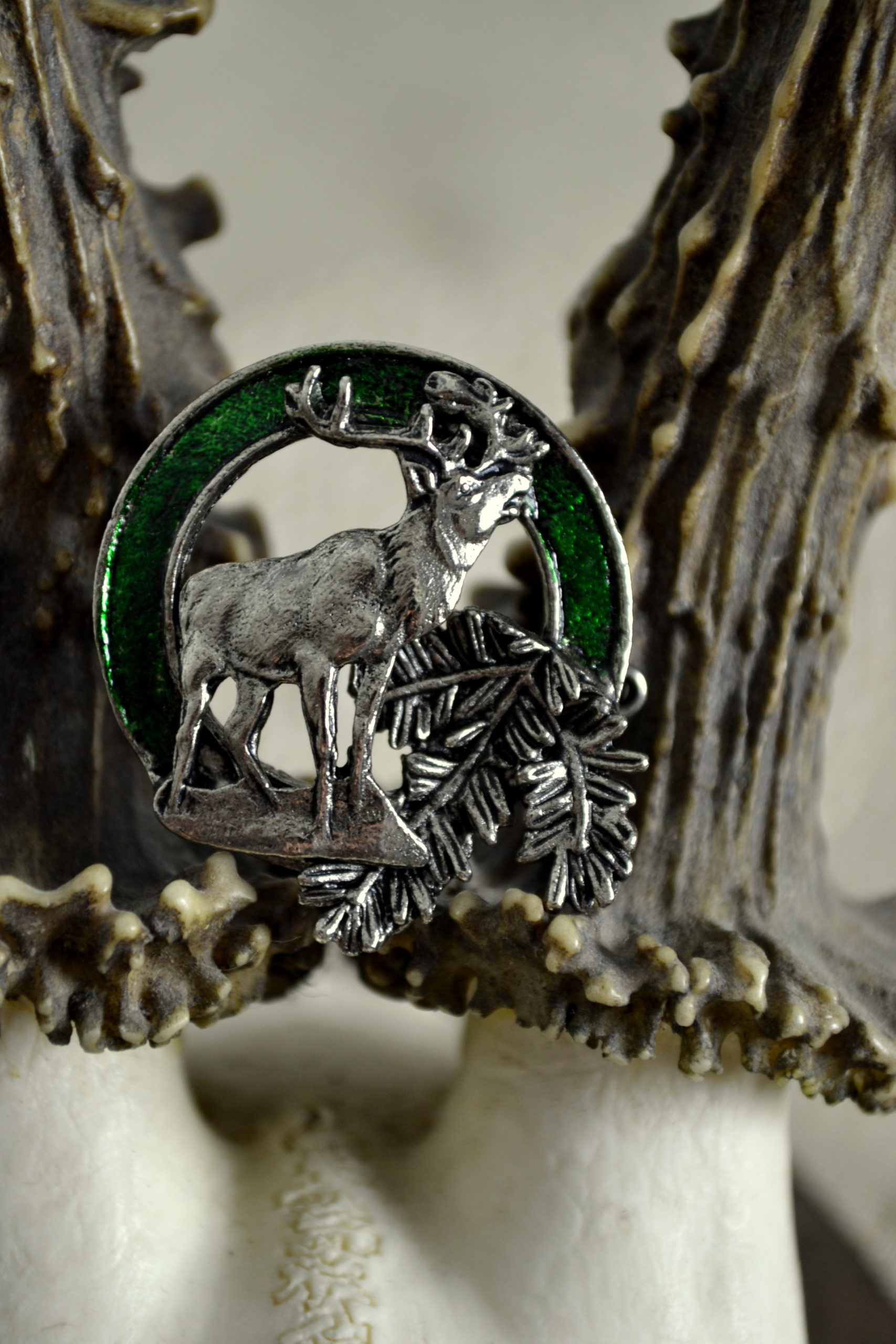 Great pin with green enameled circle with a standing elk buck at the center. Beautifully cast for great detail. Silver colour metal with light antiquing to show details and contours.