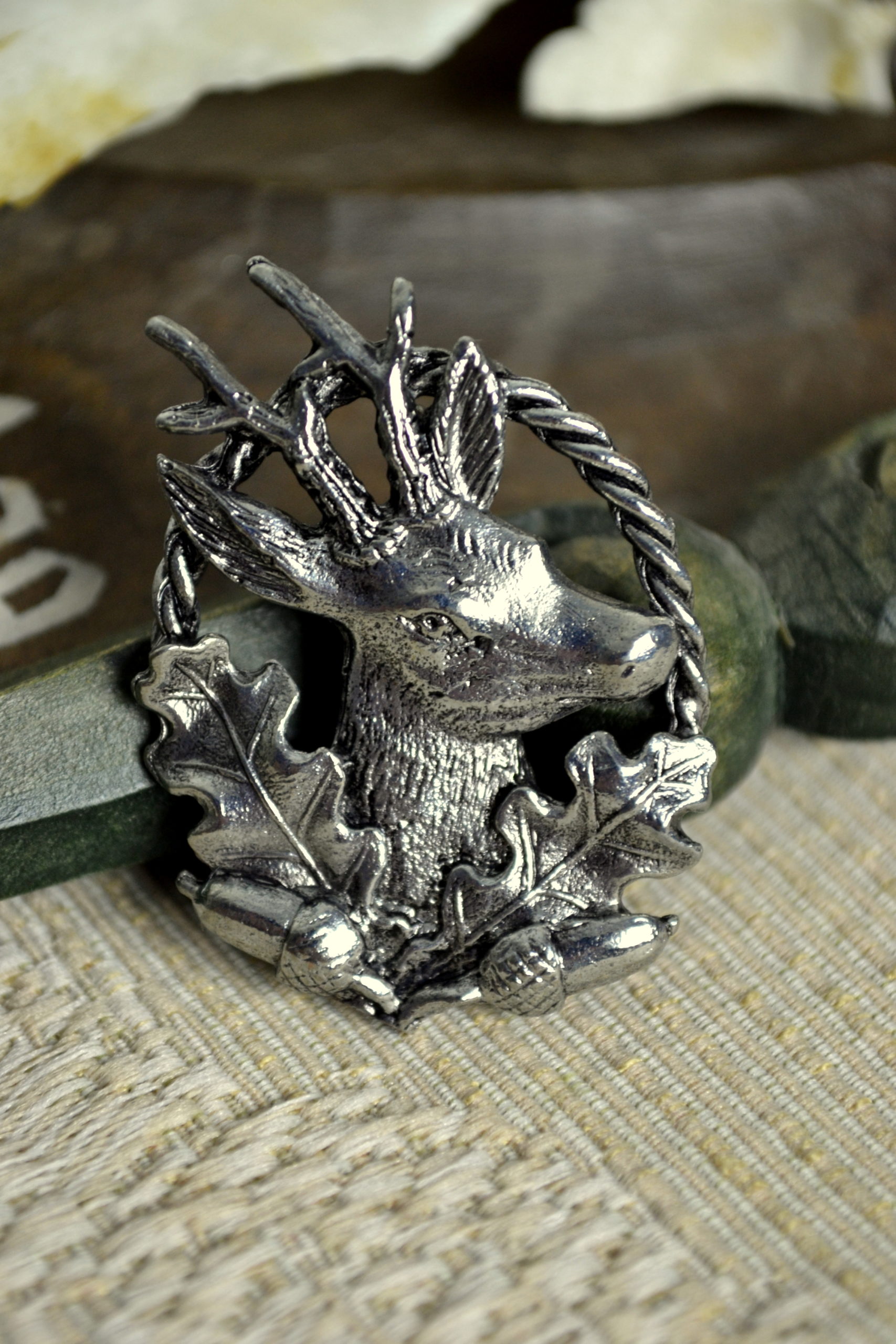 Beautifully detailed pin of a roe deer head with oak leaves and acorns surrounded by a twisted rope design. Lightly antiqued silver colour metal finish.rrMeasures approximately 1inch/2.5 cm wide x 1 3/8 inches/35 mm high. Made in Germany.