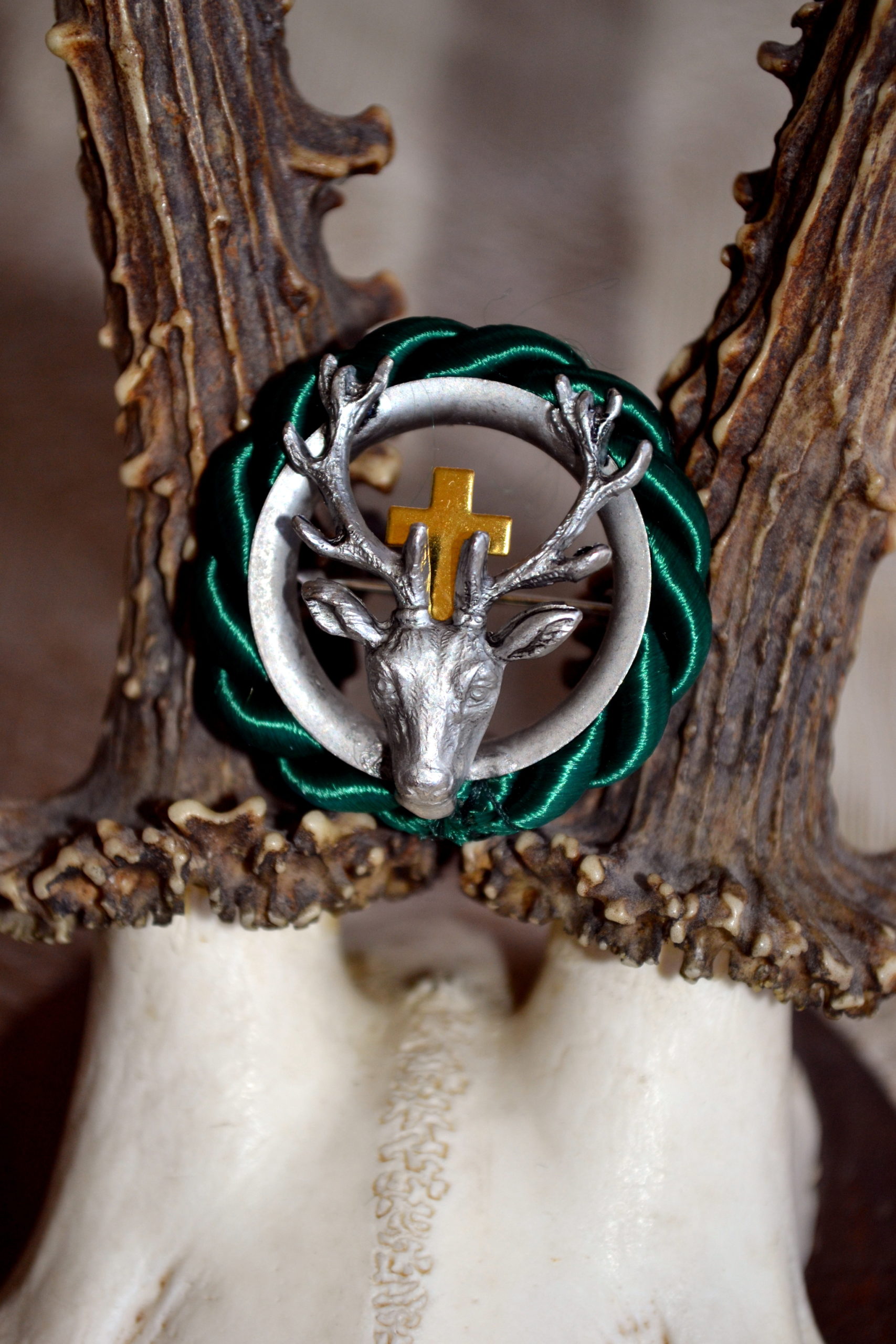 Beautifully detailed round pin with cording features the St. Hubertus deer at the centre cast in pewter-finish metal. The cross is gold-tone metal. Measures about 1 1/2 inches/ 3.7 cm across.