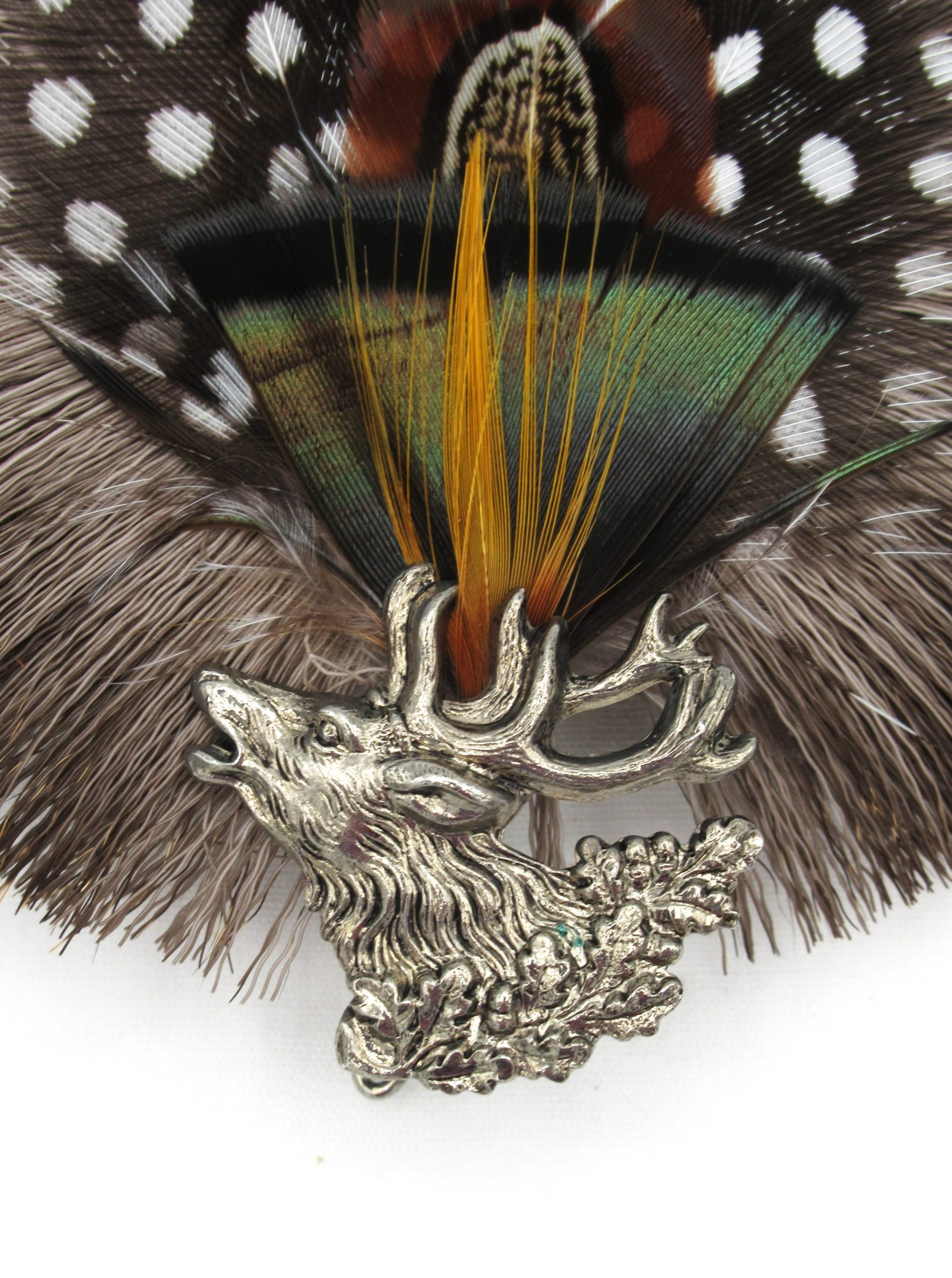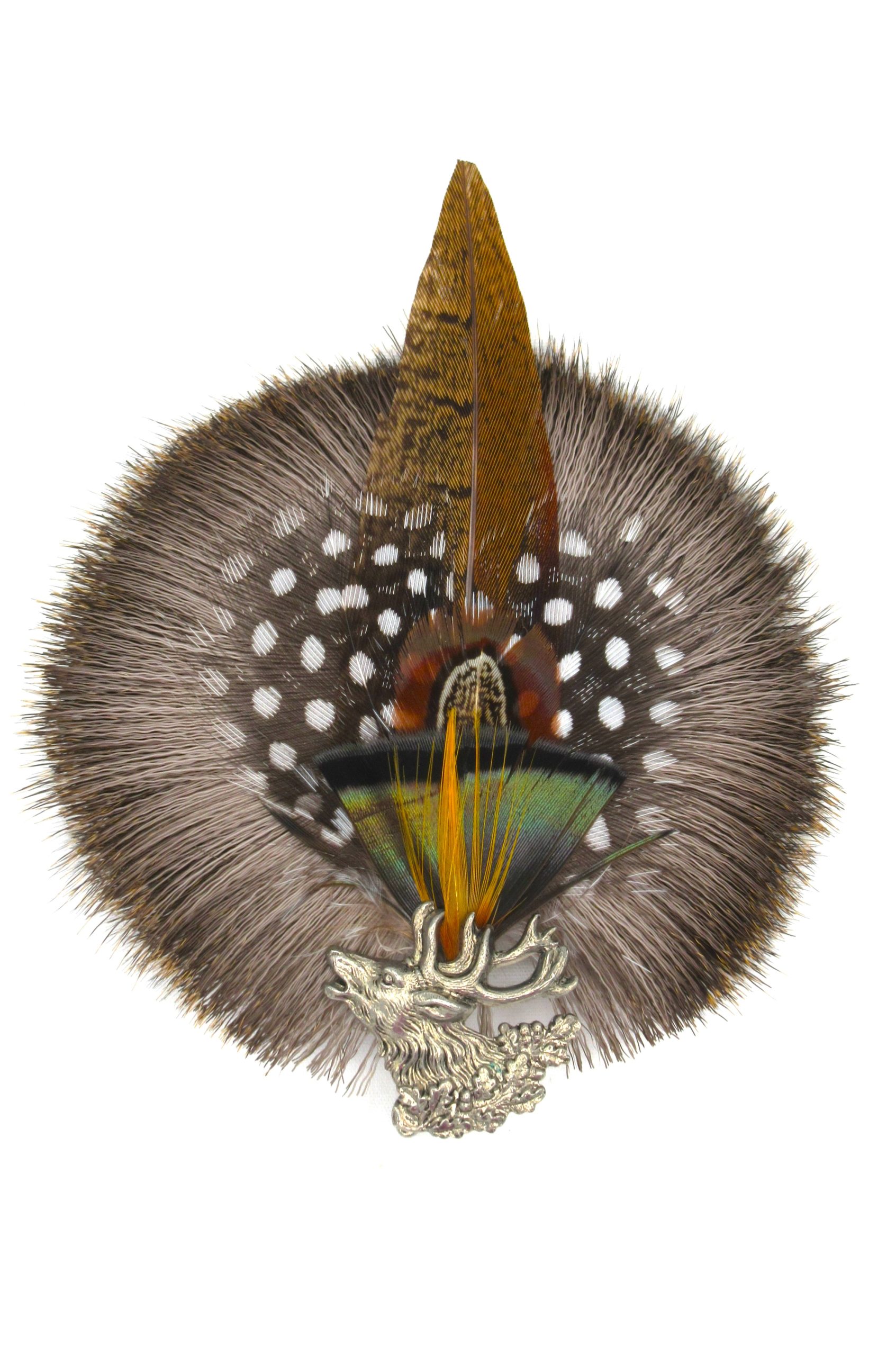 Another great accent for your favourite hat!ย  This deer hair radl features Guinea Fowl and Pheasant feathers, held in place by an antique silver holder with a stag head motif.ย  Perfect addition to any outdoorsperson’s favourite hat.