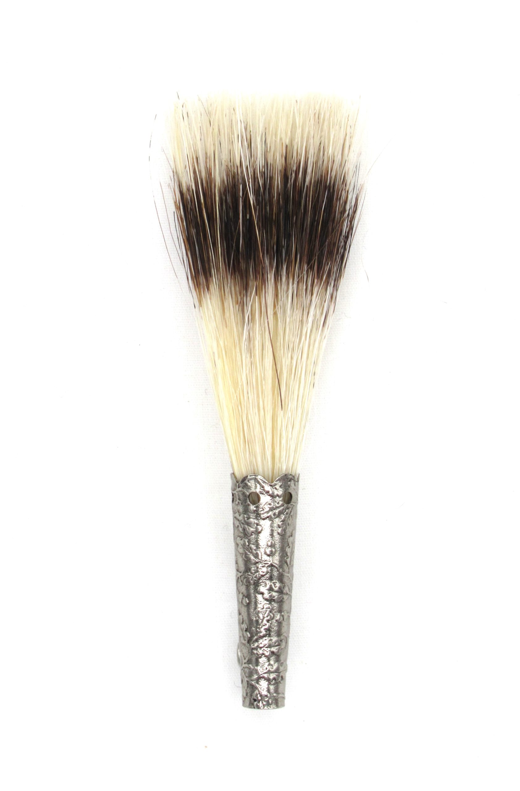 A miniature version of the traditional gamsbart, this version is just 4 inches/10.5 cm including the antique silver holder.ย Brooch type pin hold it securely in place.ย Made from horsehair and dyed to mimic the colouration of badger.ย Perfect for a child’s hat, too!