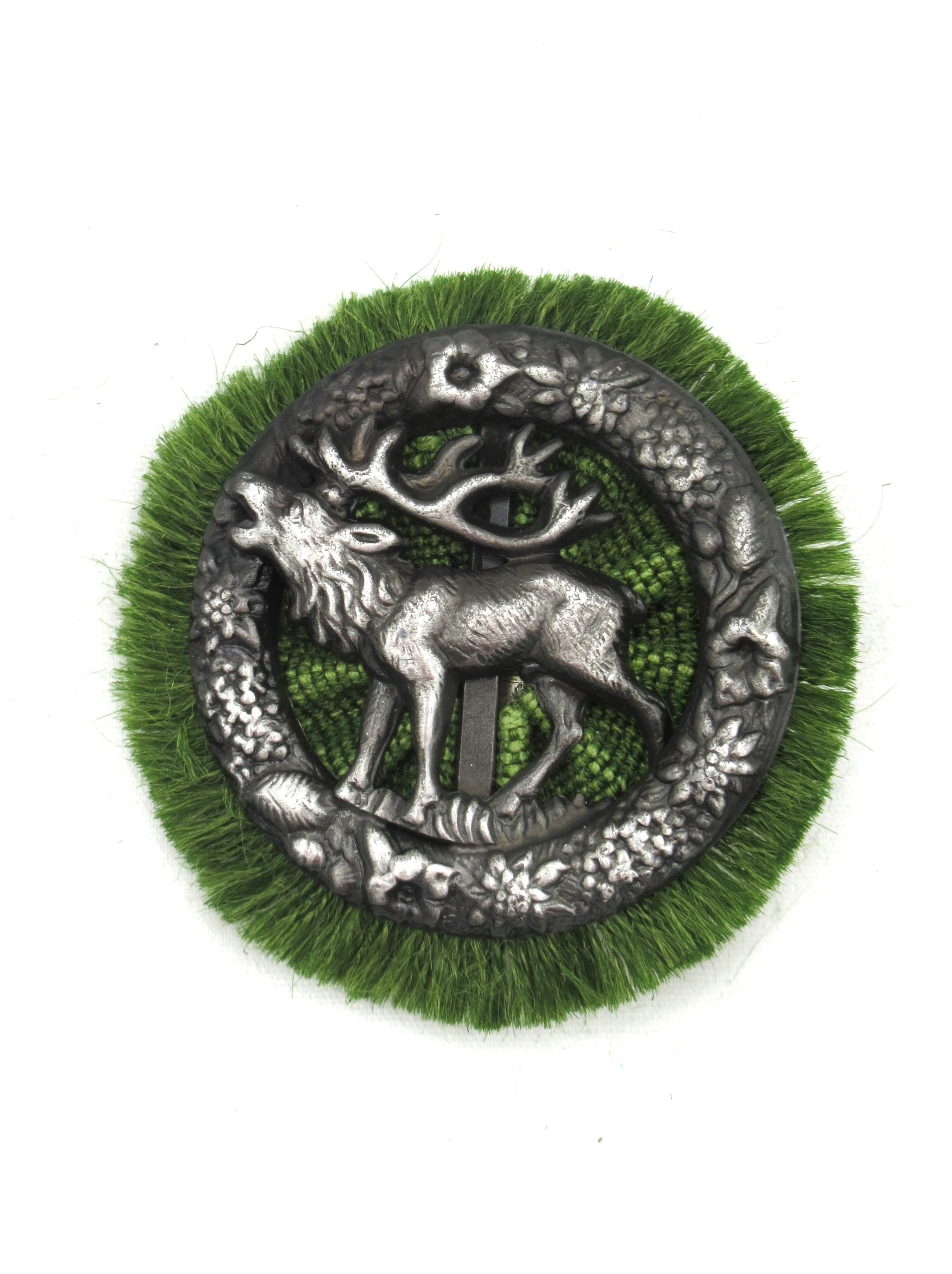 Traditional loden green fringe hat rosette features an elk stag within a foliage wreath cast in antiqued pewter.ย ย Brooch-type fastener keeps it securely attached to your favourite hat.