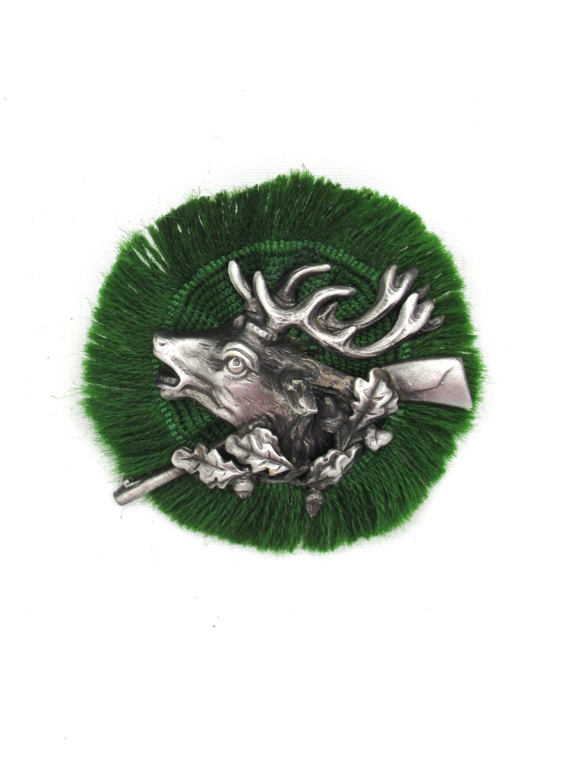 A “wow-factor” accessory for your favourite hat.ย Traditional loden green fringe rosette with 3-D stage head with oak leaves.ย Incredible detail in the casting, as always with this fine German maker.ย ย Measures approximately 4.5 cm/1.75 inches across; may vary as this is a hand-made product.