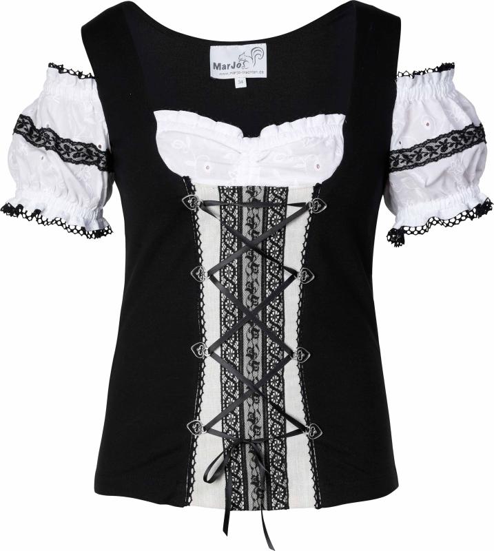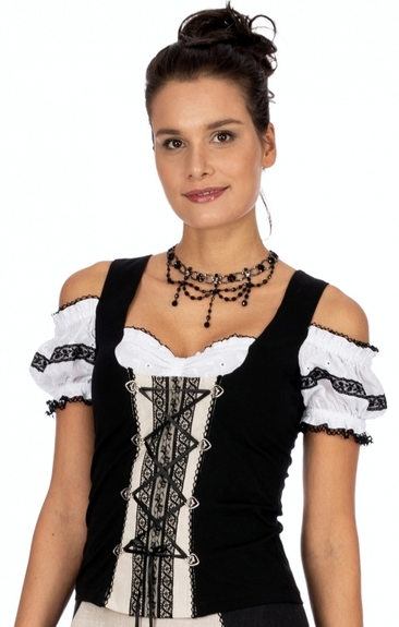 Super casual knit top is perfect over a skirt, with jeans, capris, or our denim lederhosen for those casual events. Lots of detail from the pretty heart shaped metal hooks, to the delicate lace that trims the sleeves, and also the centre front panel of the top.