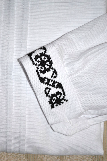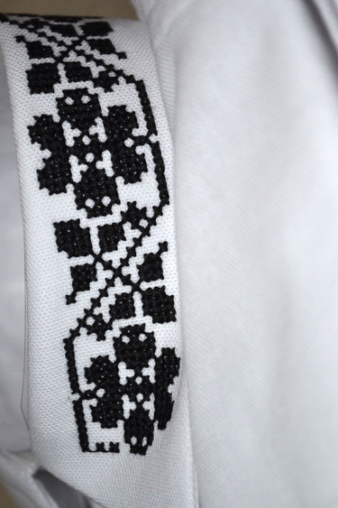 Ladies’ cotton blouse with traditional Siebenburger Sachsen black cross-stitch embroidery on collar and cuffs.