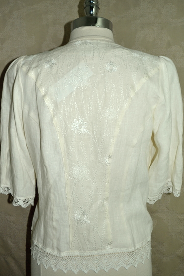 Lovely creamy-white linen blouse features embroidered panels and beautiful crochet look bobbin-lace trim on hem, sleeves and neckline.ย Laces/ties on side seams allow for precise fitting over a variety of garments.