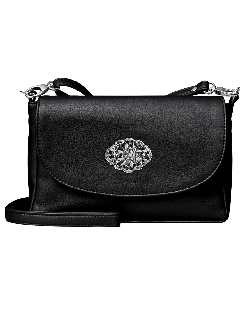 The perfect little bag for your night out, or for those times when you just want to “travel light”.ย  Compact, yet roomy enough to keep your phone and other necessities secure and close at hand. Secondary photo shows interior with some common items, and there’s still room for more!
