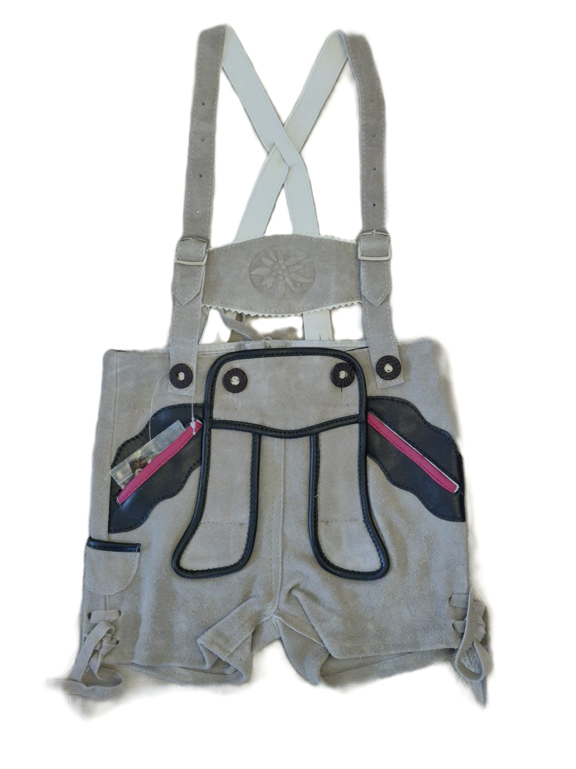 Kid’s lederhosen in traditional grey suede with dark green and red leather trim and faux deer horn buttons. Suspenders feature an embossed edelweiss on the crosspiece.