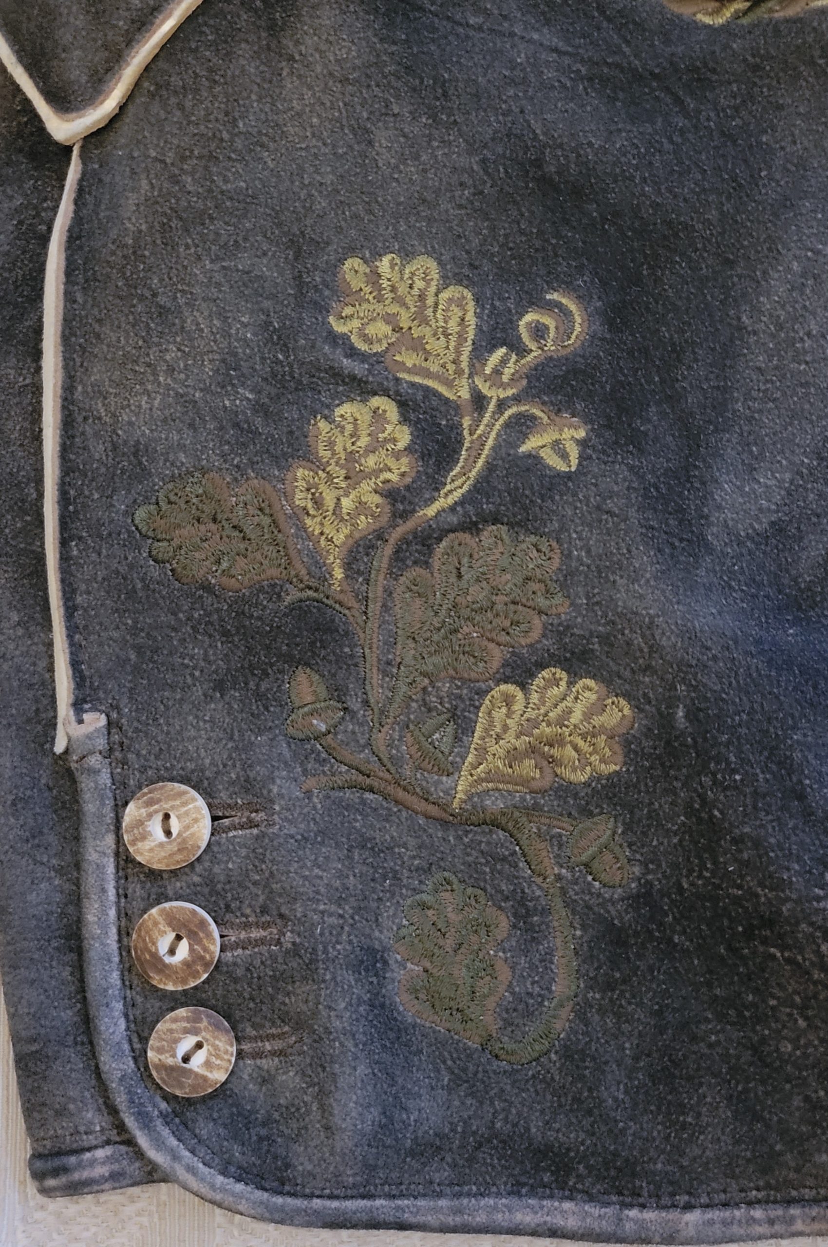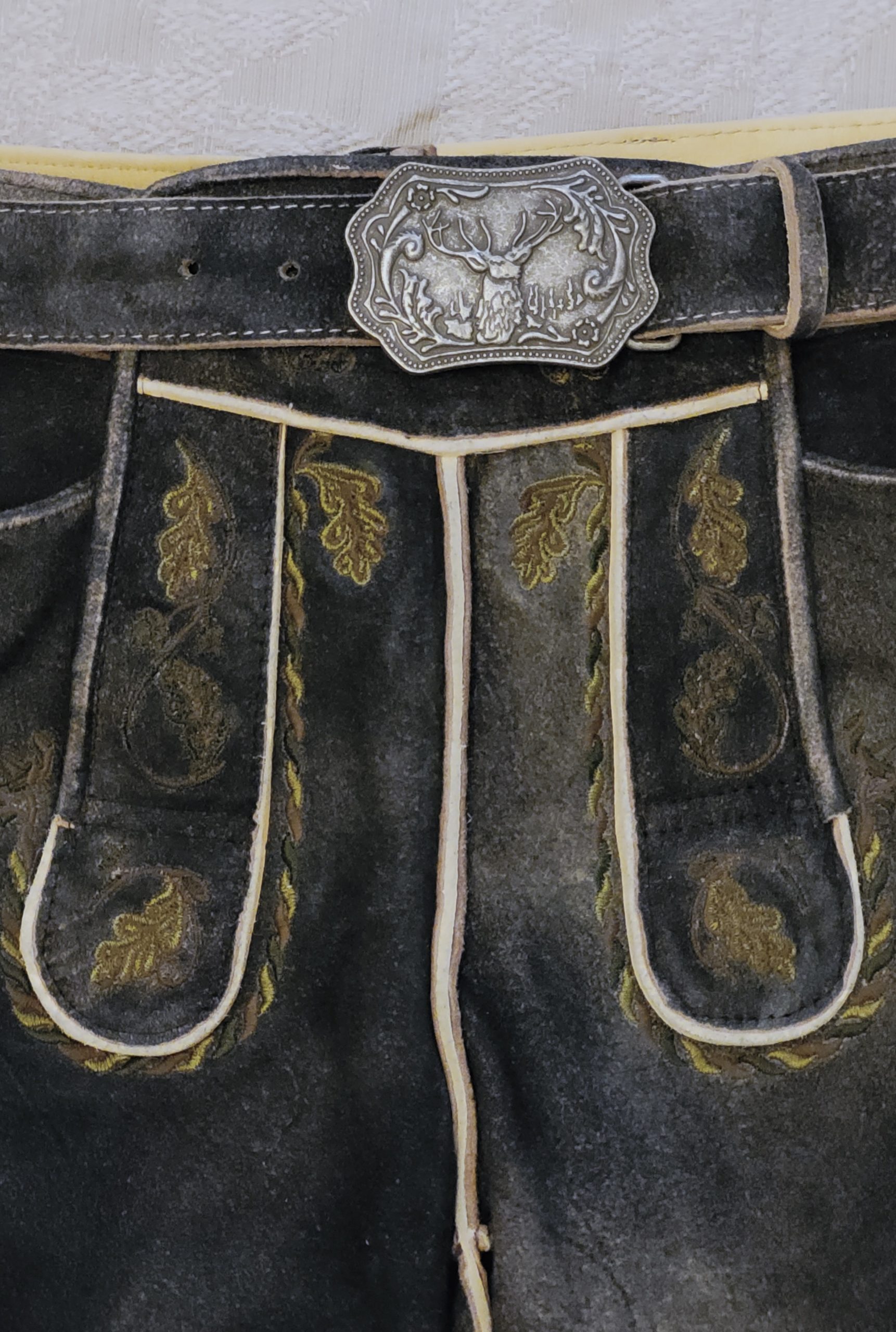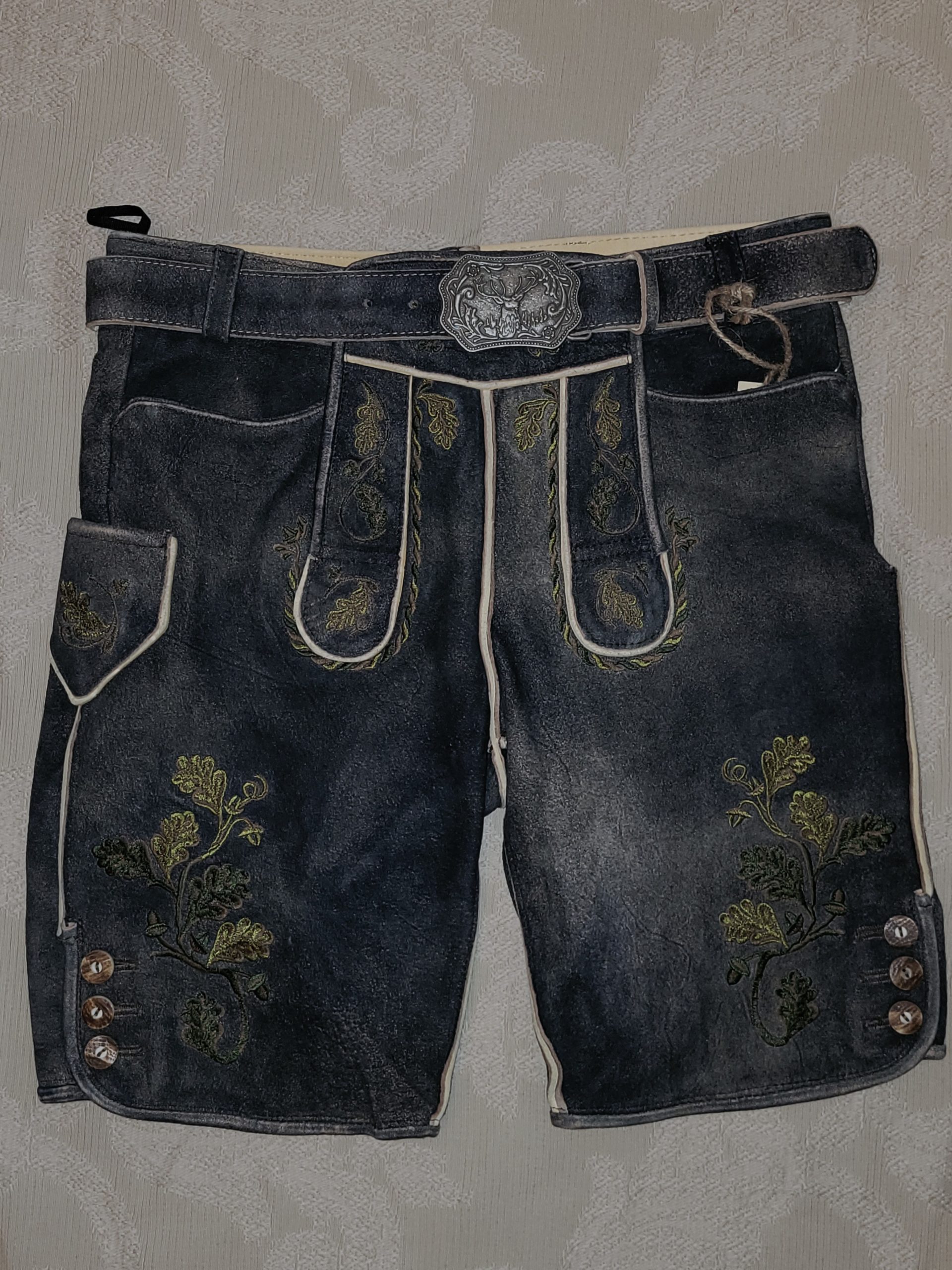 These premium lederhosen are super-soft and so comfortable to wear – no “breaking-in” required.ย ย Neutral dark grey/taupe lightly distressed suede leather with oak leaves motif embroidery in varied shades of green; the threads used have a slight sheen, so various colours are highlighted in changing light…which is difficult to portray in the photos!