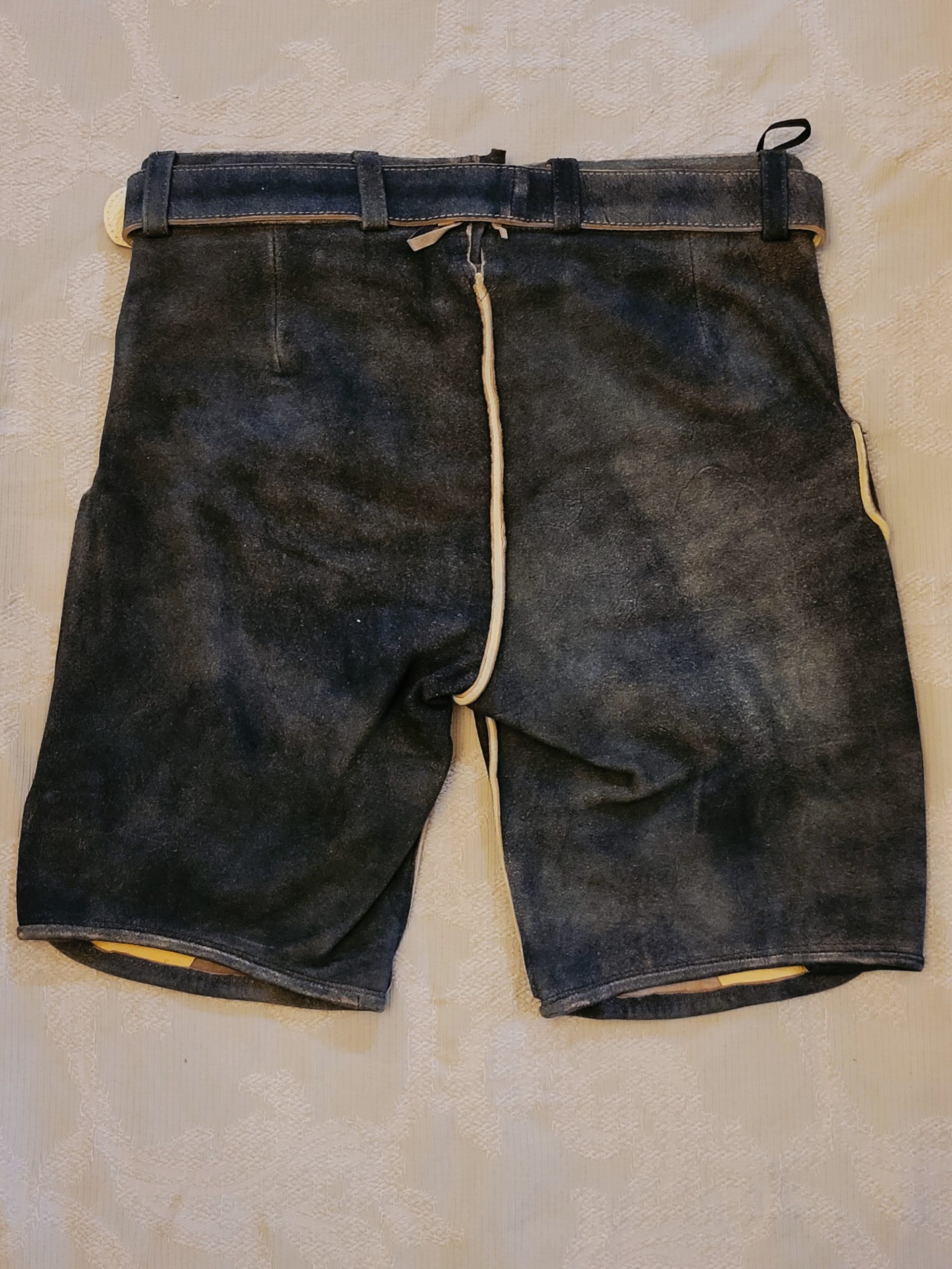 Traditional elements include horn buttons at waist and side hem, side embroidered triangular “knife” pocket, and contrast natural leather piping at seams .ย Belt with embossed stag motif buckle is included.ย No suspenders included or available for these shorts, as Bavarians have moved away from that style in recent years.