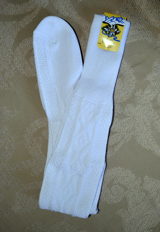 Double cuff socks for lederhosen. Excellent quality, great for dance groups!ย Intricate cable and texture design on leg; smooth foot.