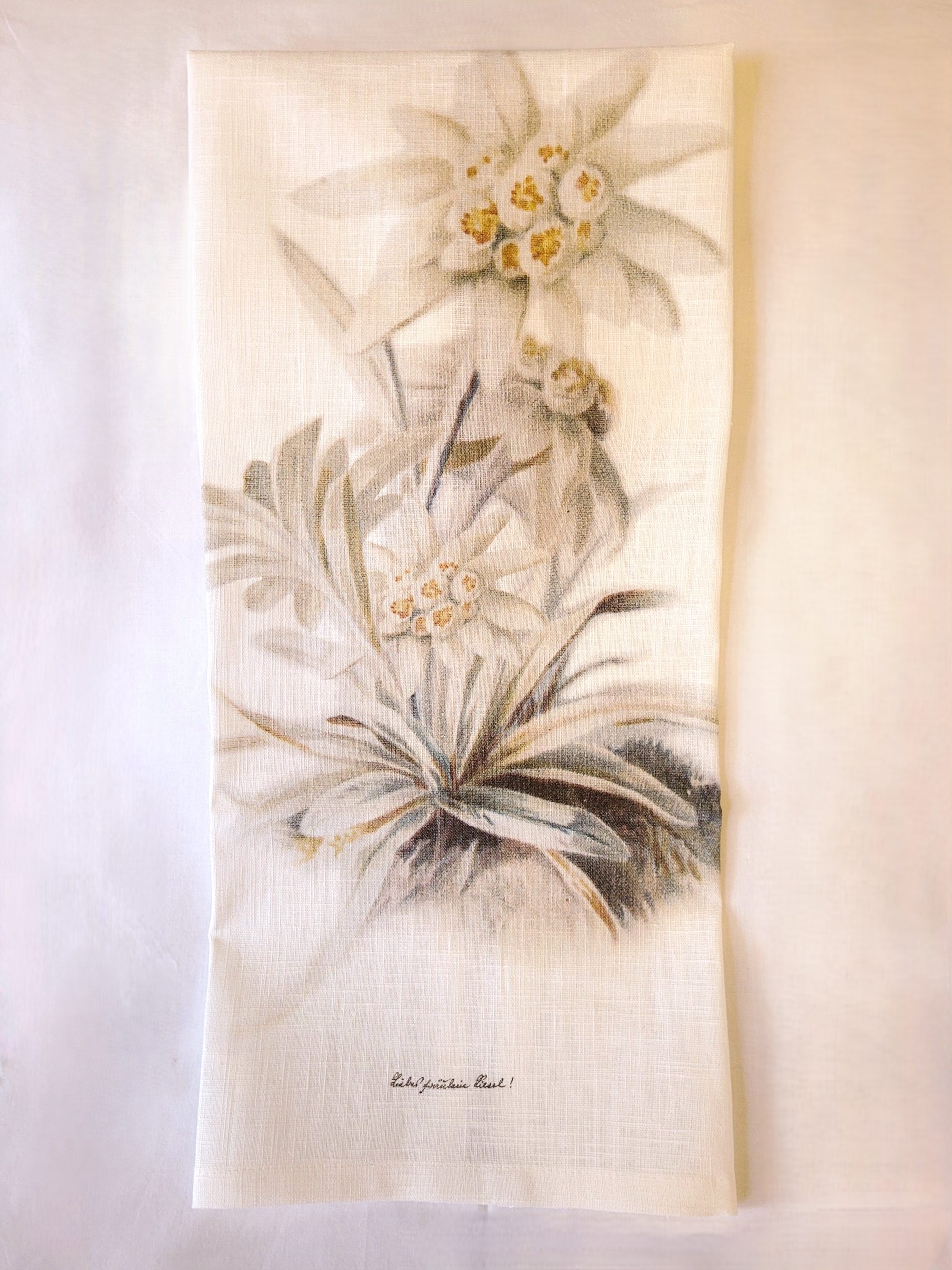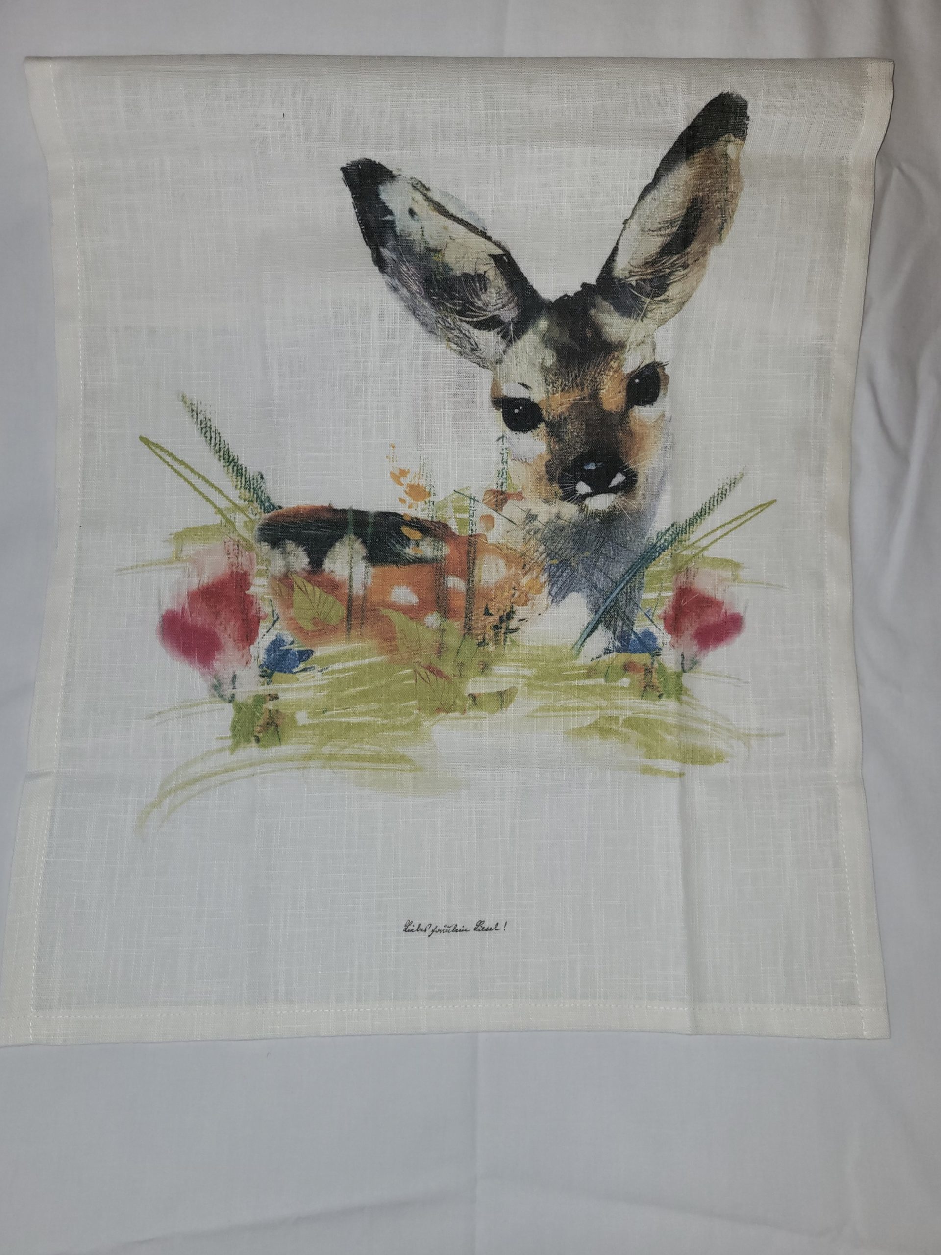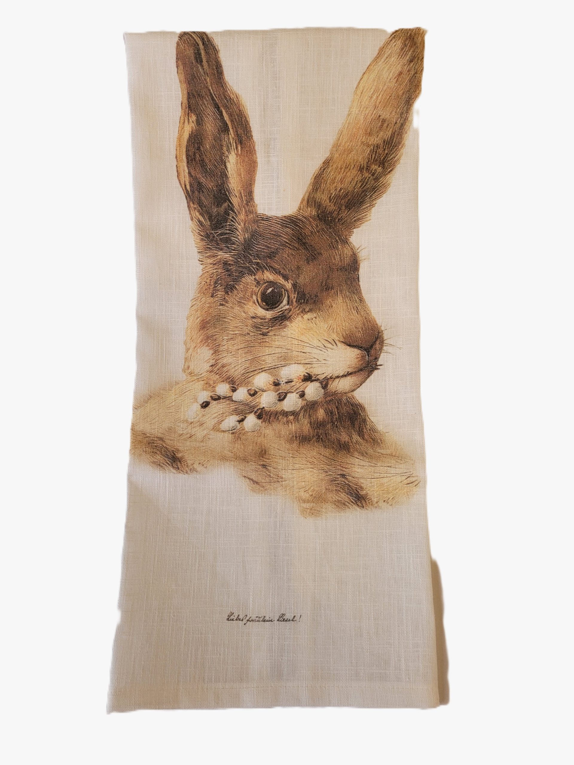 Made in Germany, these quality 24″ x 17″ย 100% linen tea towels feature motifs taken from vintage postcards and greeting cards.ย Available in four designs, Good Luck Gnome (seated on a toadstool…also a traditional good-luck charm); Bambi, a wide-eyed fawn nestled among the grass and flowers; Bunny, a sweet little fellow with sprigs of pussy-willows in his mouth; and Edelweiss, printed in natural colours of sage green, taupe and gold.ย Fabric hanging loop at top centre; but these motifs are so unique, you’ll want to hang them where they can be seen!ย All have a great European vintage vibe, perfect in your farmhouse or cottage-y kitchen…and being linen, they are great for getting those spots off glassware or cutlery as you set your holiday table.