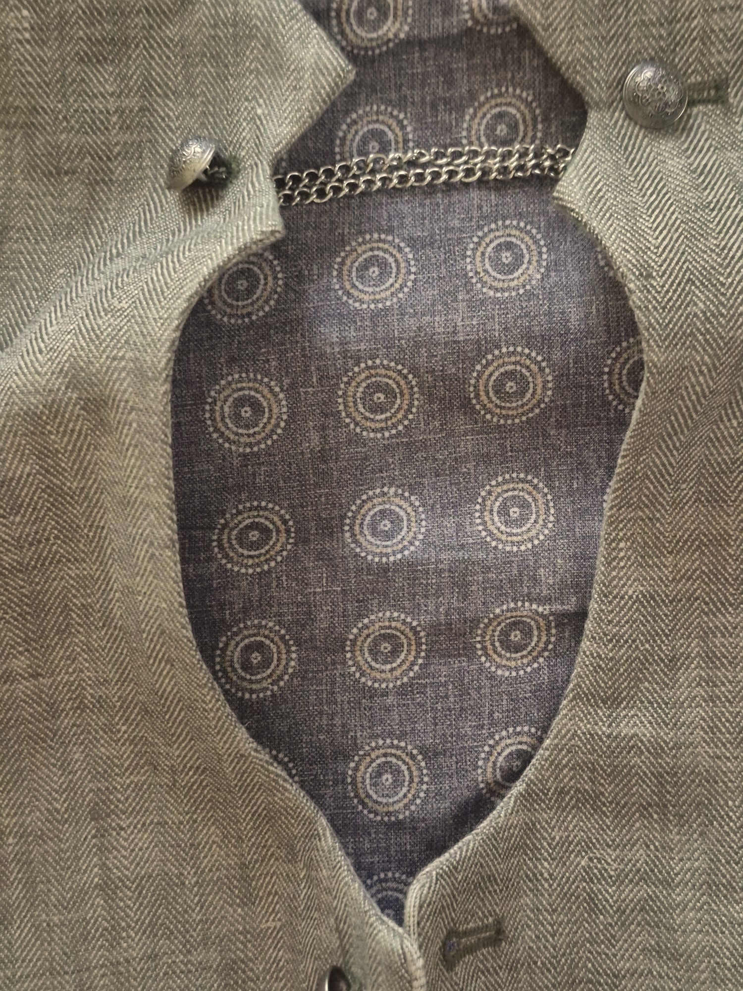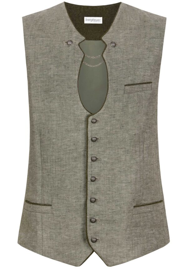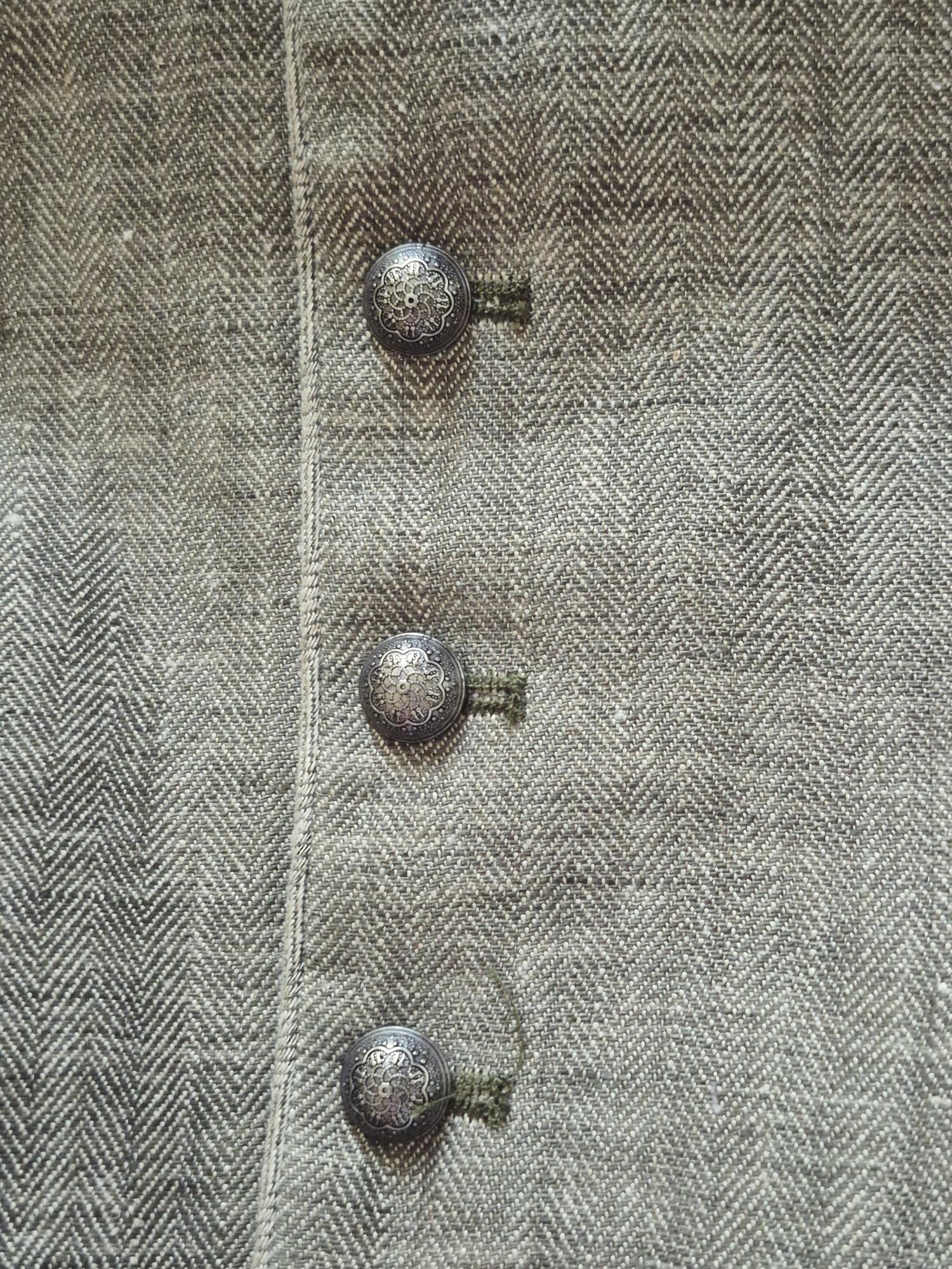 Linen vest in a “Miesbacher” style has a herringbone weave in two shades of olive that give it added interest.ย Antique silver tone domed buttons with embossed motif.ย Fully-lined with cotton in a coordinating print. Front facings are a lighter version of the vest linen fabric.ย ย Back is black poly with half-belt to adjust fit at the waist.