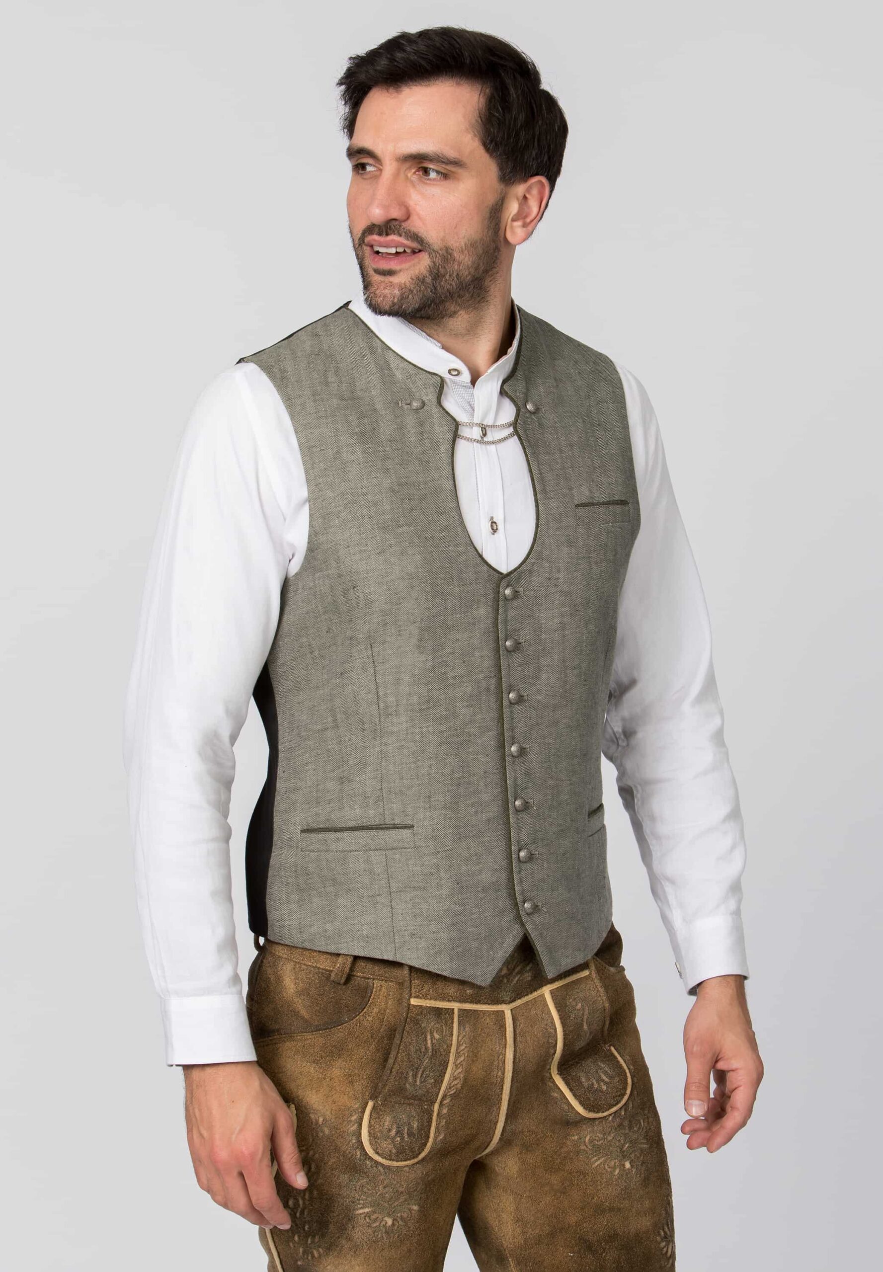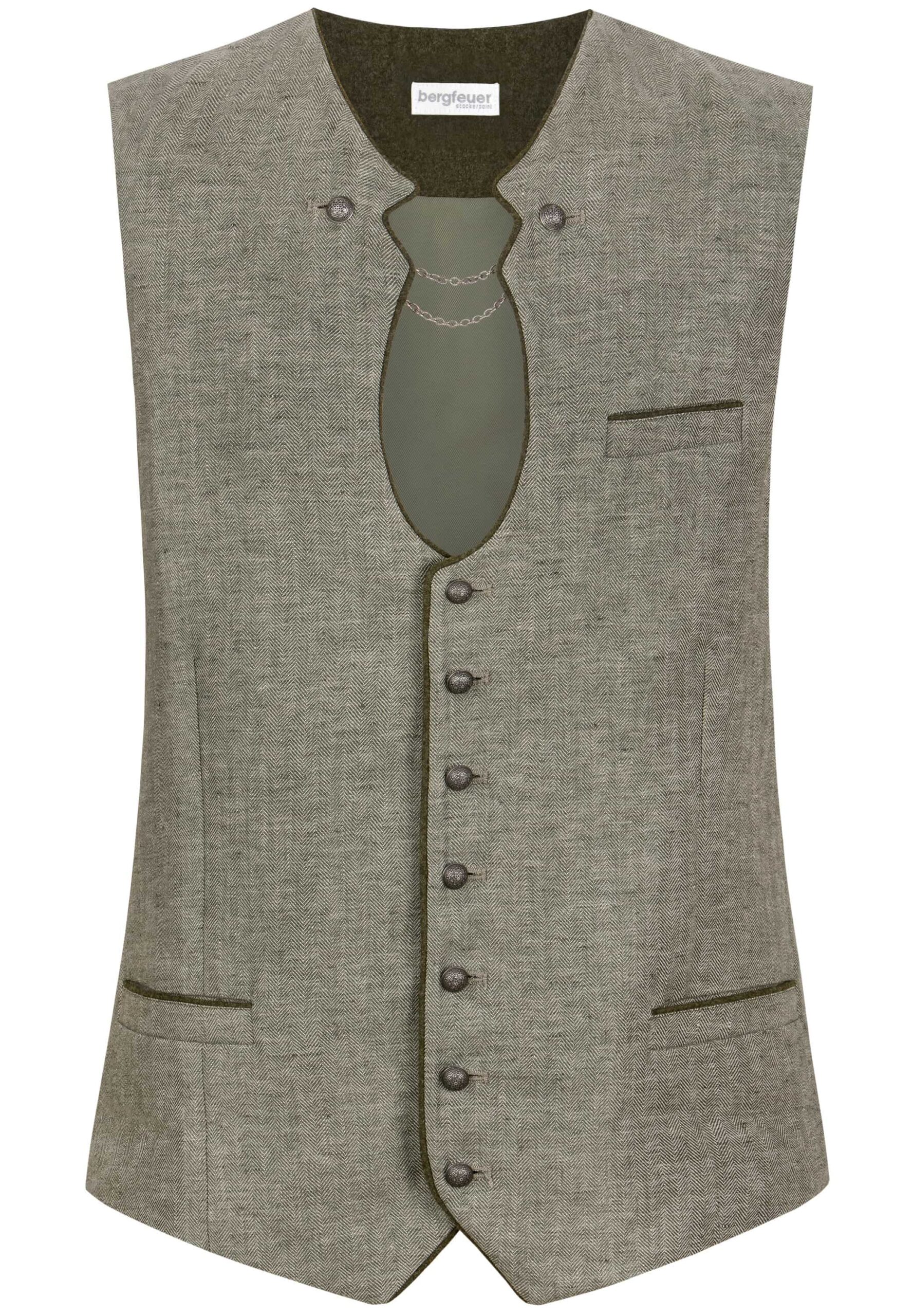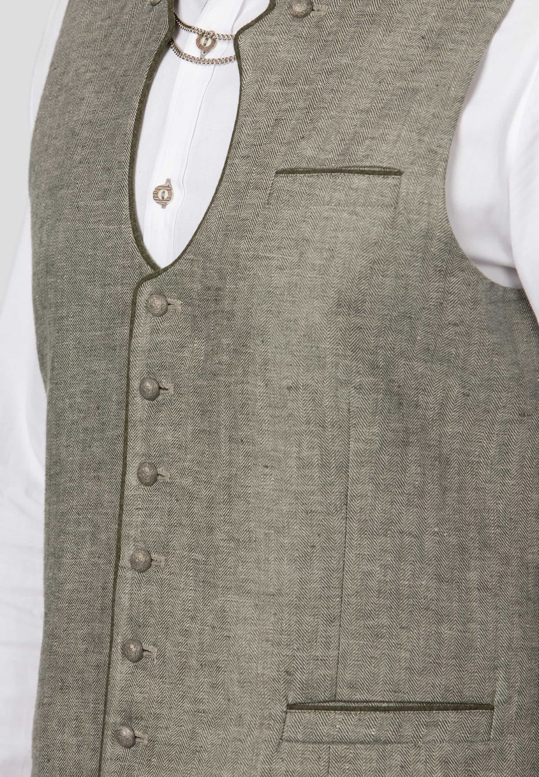 Linen vest in a “Miesbacher” style has a herringbone weave in two shades of olive that give it added interest.ย Antique silver tone domed buttons with embossed motif.ย Fully-lined with cotton in a coordinating print. Front facings are a lighter version of the vest linen fabric.ย ย Back is black poly with half-belt to adjust fit at the waist.