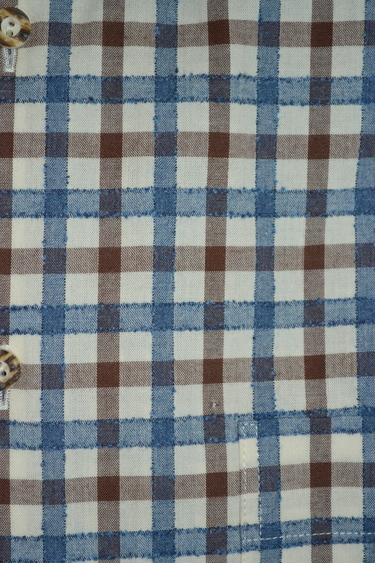 Casual rustic check pattern in a great chambray/denim blue and taupe combination with creamy white. Perfect for office casual or paired with brown lederhosen. Contrast denim blue oxford cloth lining inside the collar and cuffs. Faux horn buttons.rr100% Turkish cotton; machine wash in cold water and hang to dry.