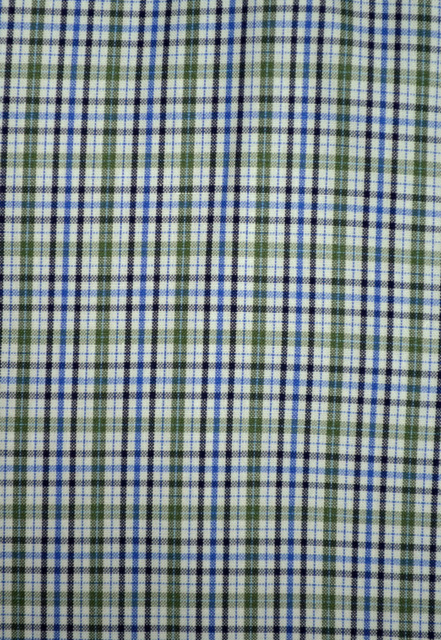 Super high quality long-sleeved cotton shirt in a great small-scale plaid in olive green, light blue and black on a white background. This versatile shirt is perfect for business-casual wear with khakis, or weekend wear with your favourite dark wash denim. Of course, you can also pair it with our fab black leders!