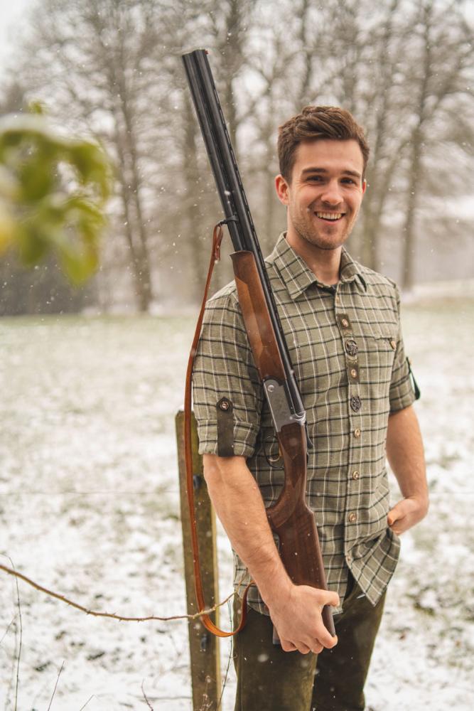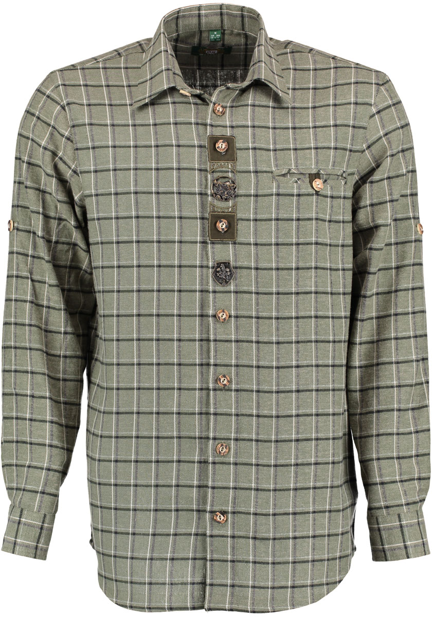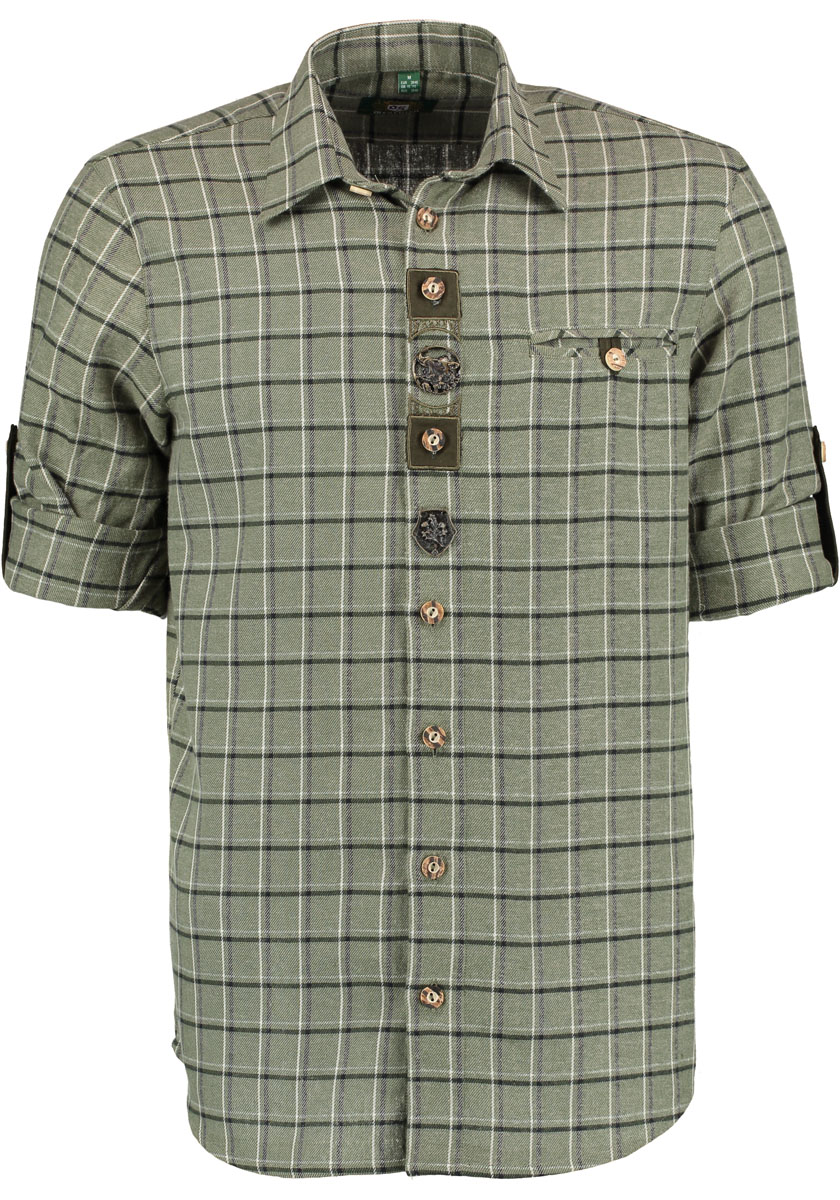 Super-soft flannel shirt in light olive green with black and white narrow stripes to form a large format plaid.ย  Convertible sleeves may be rolled up to above the elbow and held in place with deep green faux suede fabric tabs.ย  The front placket of the shirt is decorated with a detailed metal casting of a boar’s head together with embroidering and a metal charm with oak/acorn motif.ย  ย  Traditional faux horn buttons.