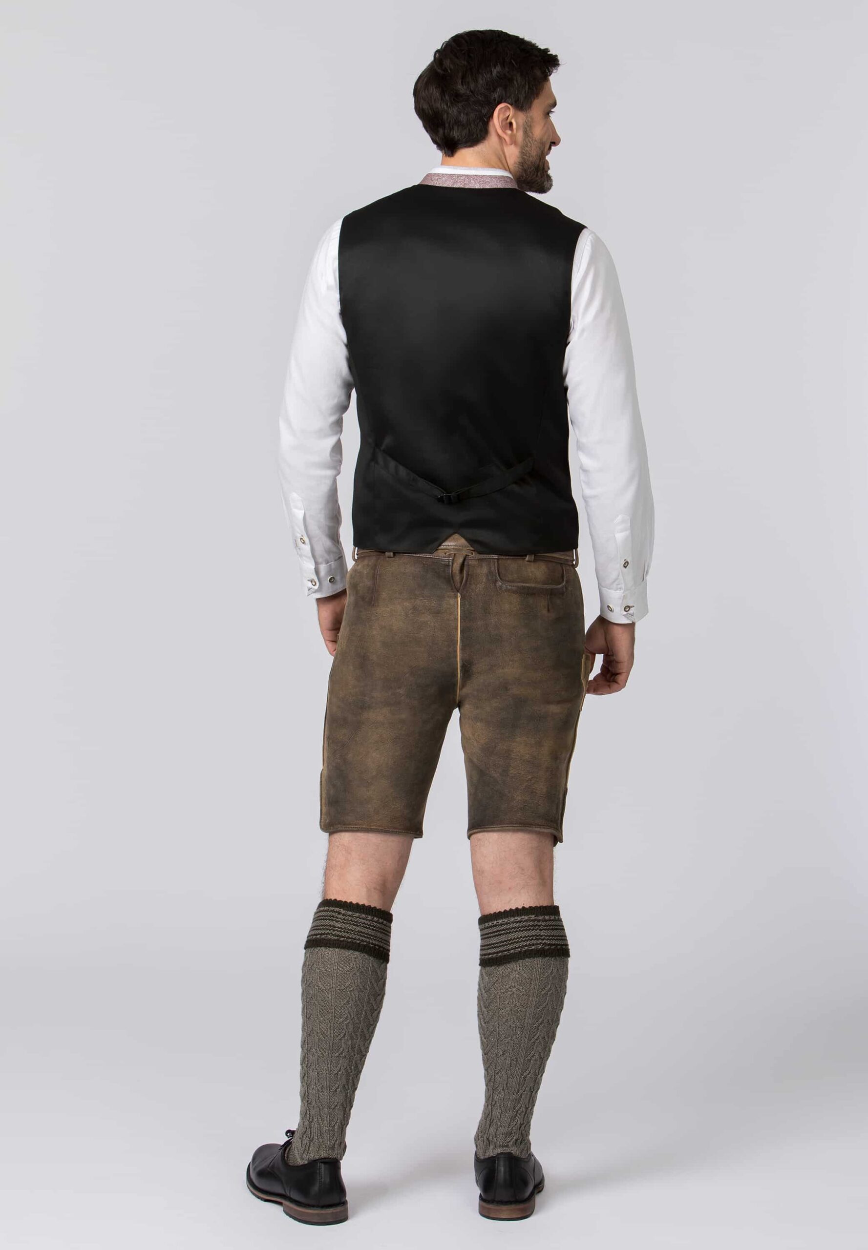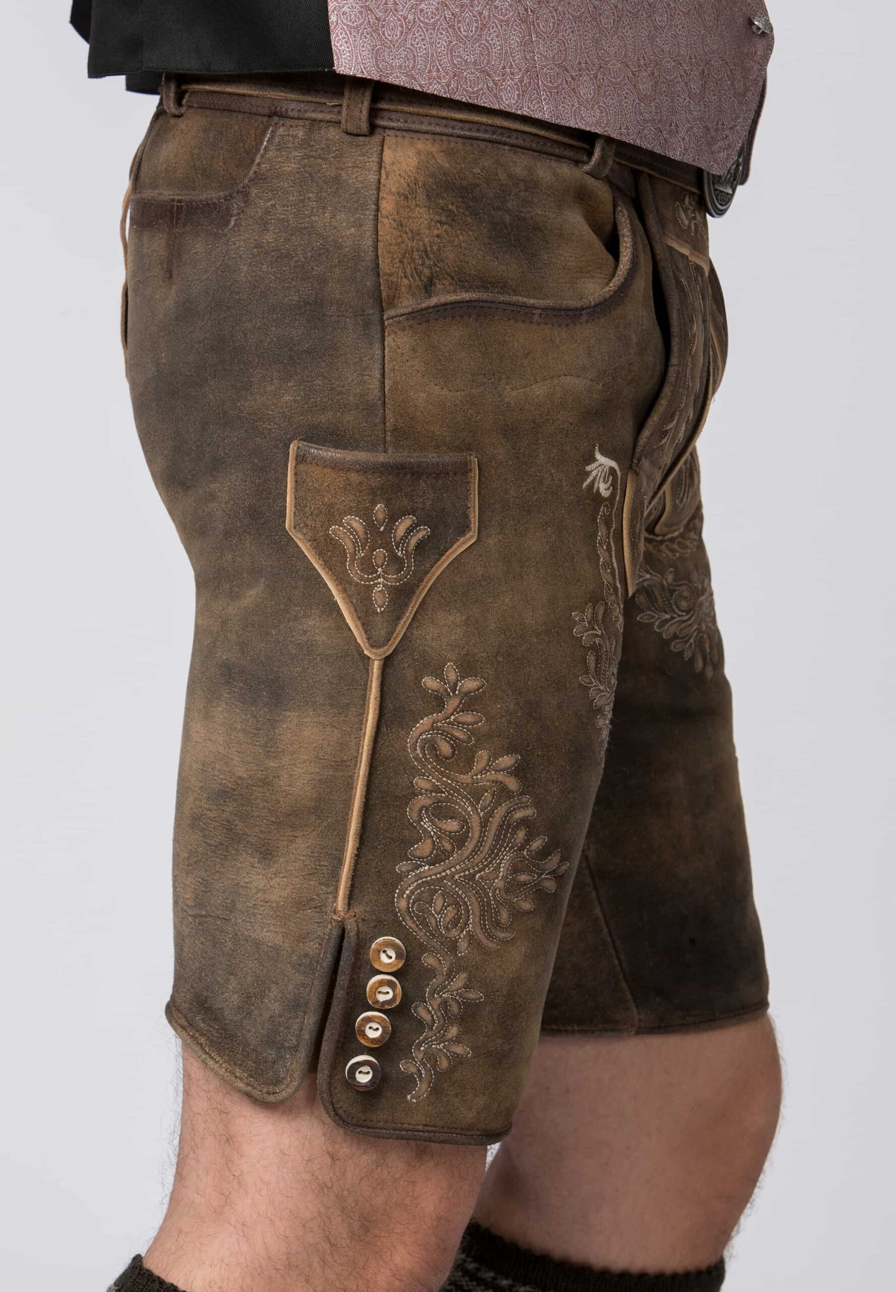Men’s antique brown lederhosen short with taupe tonal embroidery accents and traditional buttons on outside leg.ย Belt included.