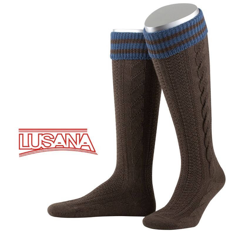 Traditional socks worn with lederhosen shorts or knickers, medium brown with medium blue stripes around the fold-down cuff.