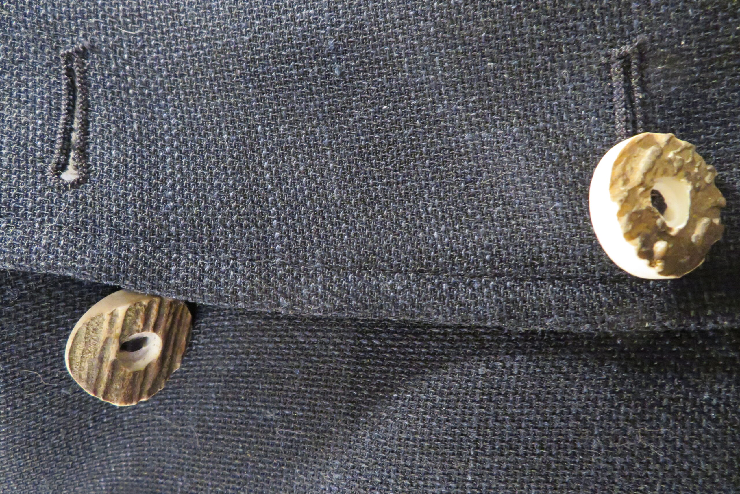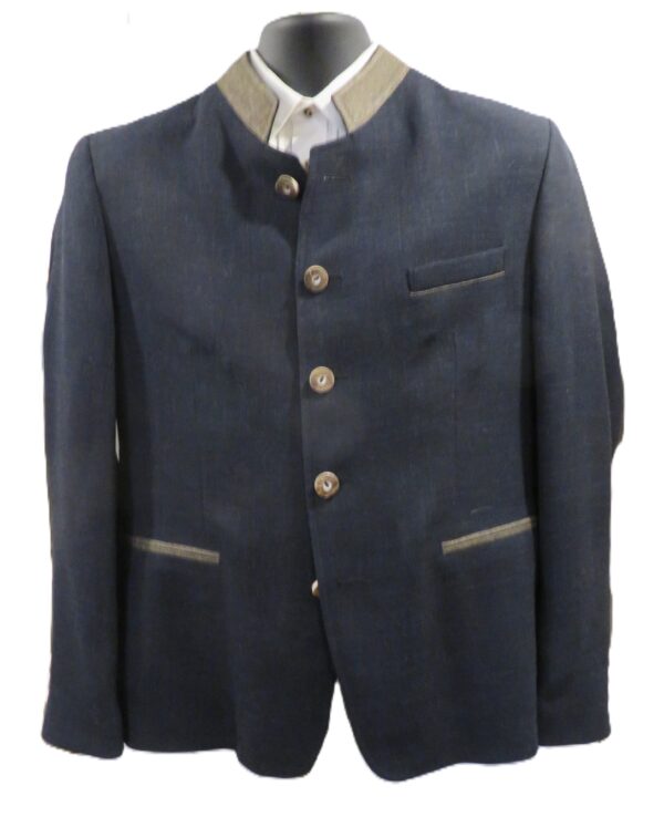Men’s linen blend traditional trachten jacket.ย Premium quality by Lodenfrey.ย 55/35/10 polyester/cotton/linen construction (easy-care) with acetate lining.ย Horn buttons.ย Navy with tan collar and pocket trim.ย Vented back.ย Pairs well with dress slacks or lederhosen for that casual look.
