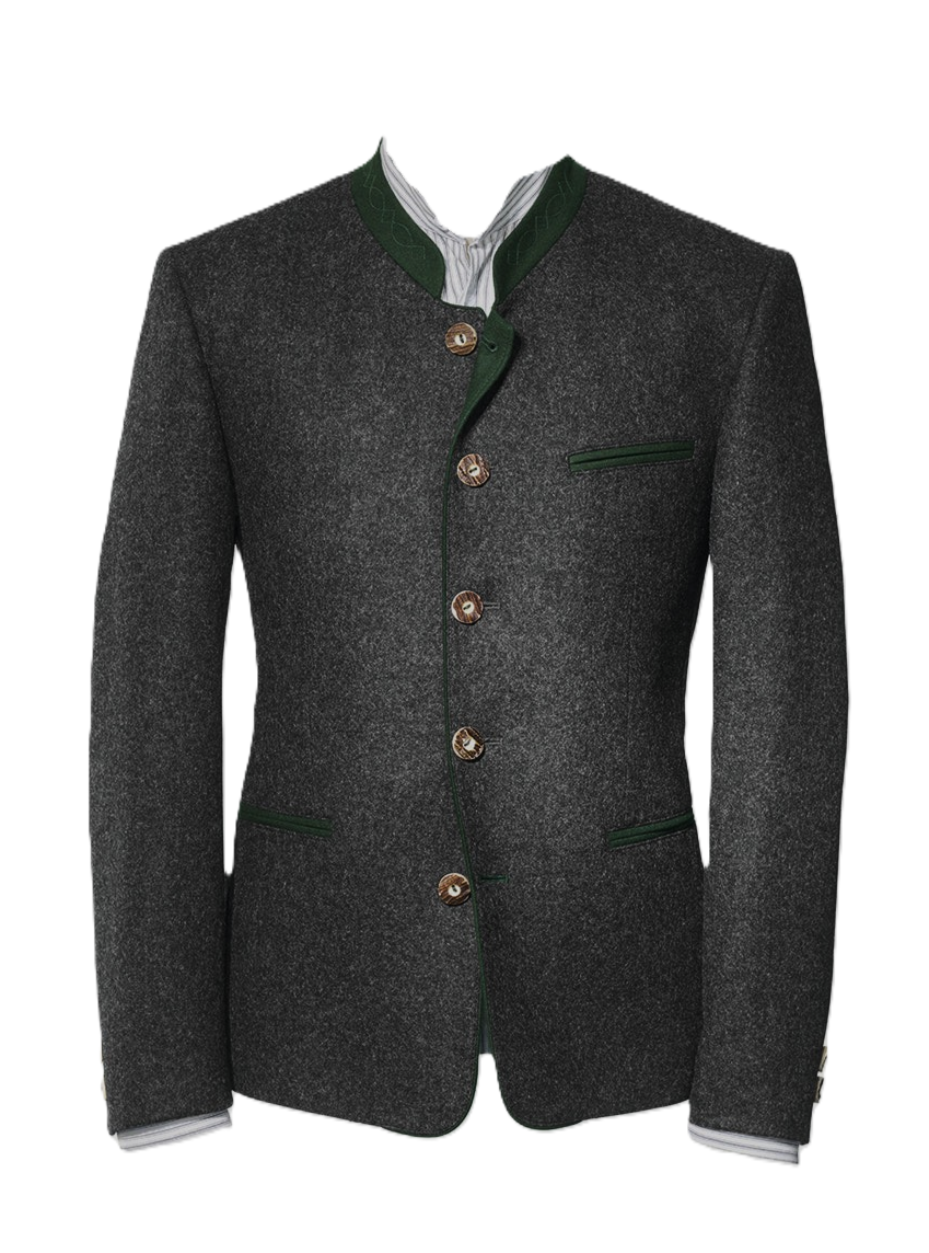 Great quality in this traditional loden jacket which features traditional green accents in the embroidered stand-up collar, pocket trim and front facings.ย Fully lined with the traditional joppe back pleat that extends from just between the shoulder blades to hem.ย Horn buttons on front and cuffs.ย ย Two inside chest pockets in addition to the two pockets on the front of the jacket.