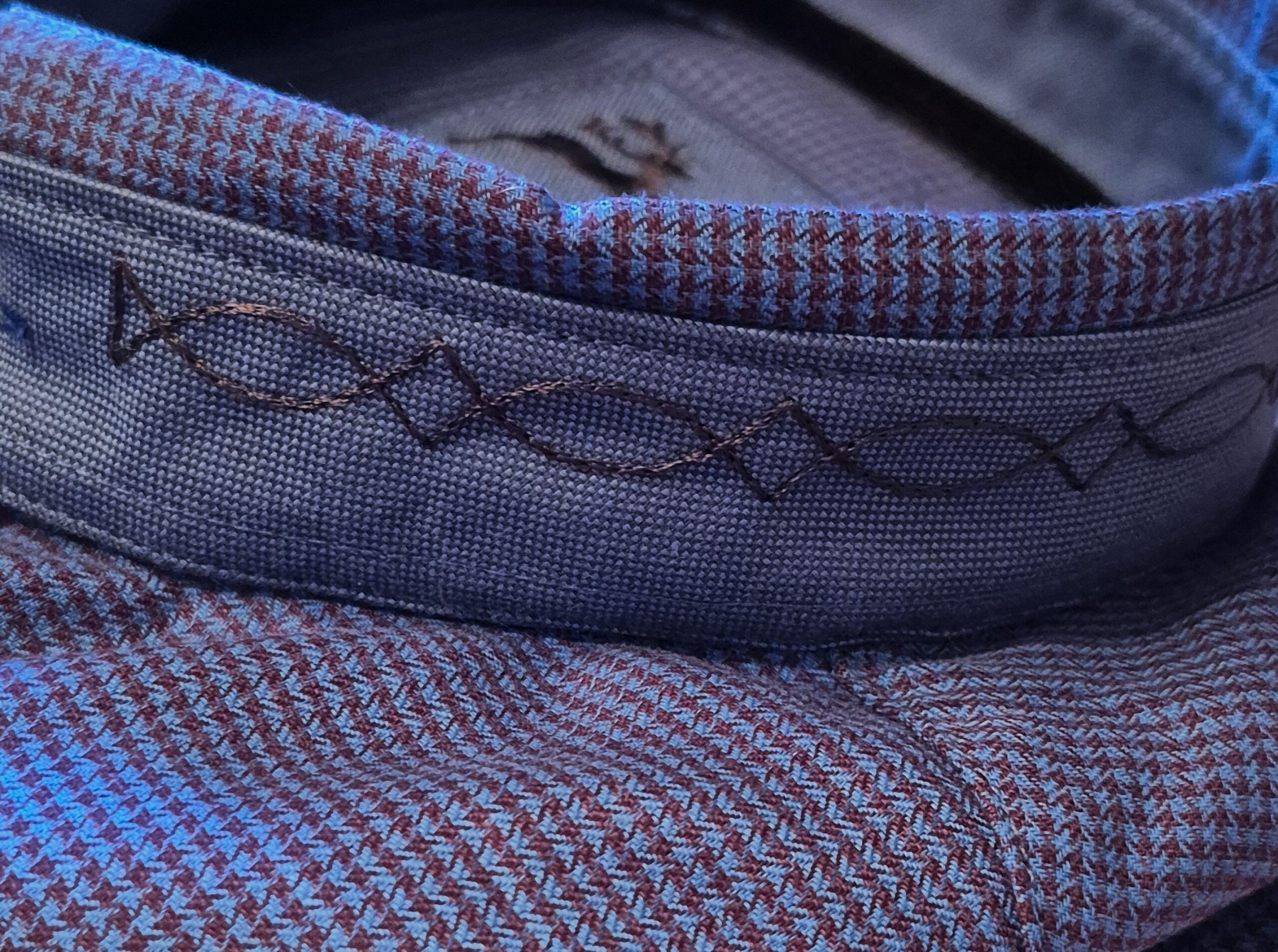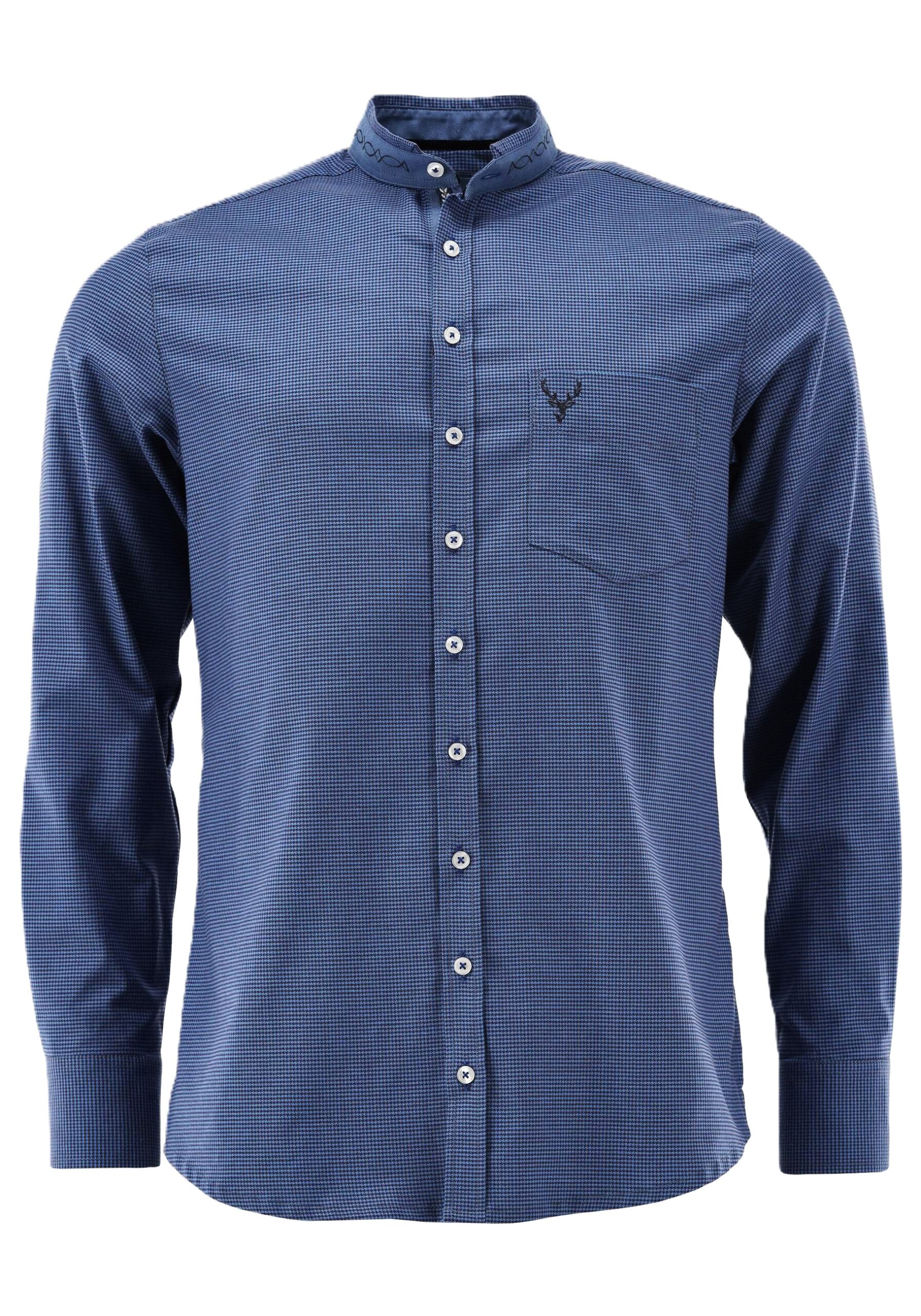A great-looking shirt for fest, office, or date night features trending stand-up collar with contrast band with embroidery; and embroidered tape trim at the cuff placket for added interest.ย ย The tape trim is repeated under the front placket, and is exposed when the top button(s) are not fastened.ย Contrast embroidered stag head on the chest pocket.ย Tiny micro houndstooth check print in black combined with bright royal blue on a soft high-count cotton with a touch of spandex for comfort and ease.