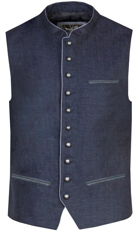 Nice lighter-weight linen vest in navy blue, with matching acetate brocade back; half belt with slider to adjust fit at back waist.ย Traditional gunmetal grey round buttons, and stand-up collar.ย Contrast piping and pocket banding.