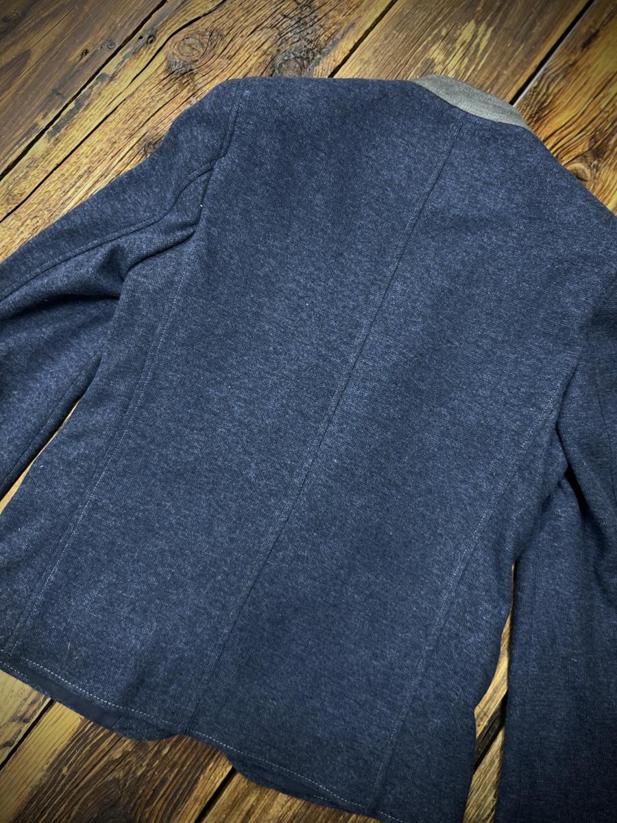 All the great traditional elements are there, as you would expect in an Allwerk jacket, combined with contemporary styling that lets this jacket go from cultural events, to the office to date night with ease.ย Dark brown bone buttons, top-stitching on the front darts, pockets and along the edges of the front closure, and the traditional stand-up collar in grey suede with a contrasting charcoal grey button tab to provide an additional modern element.