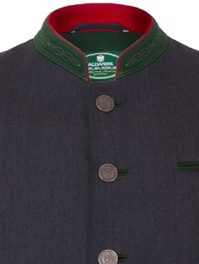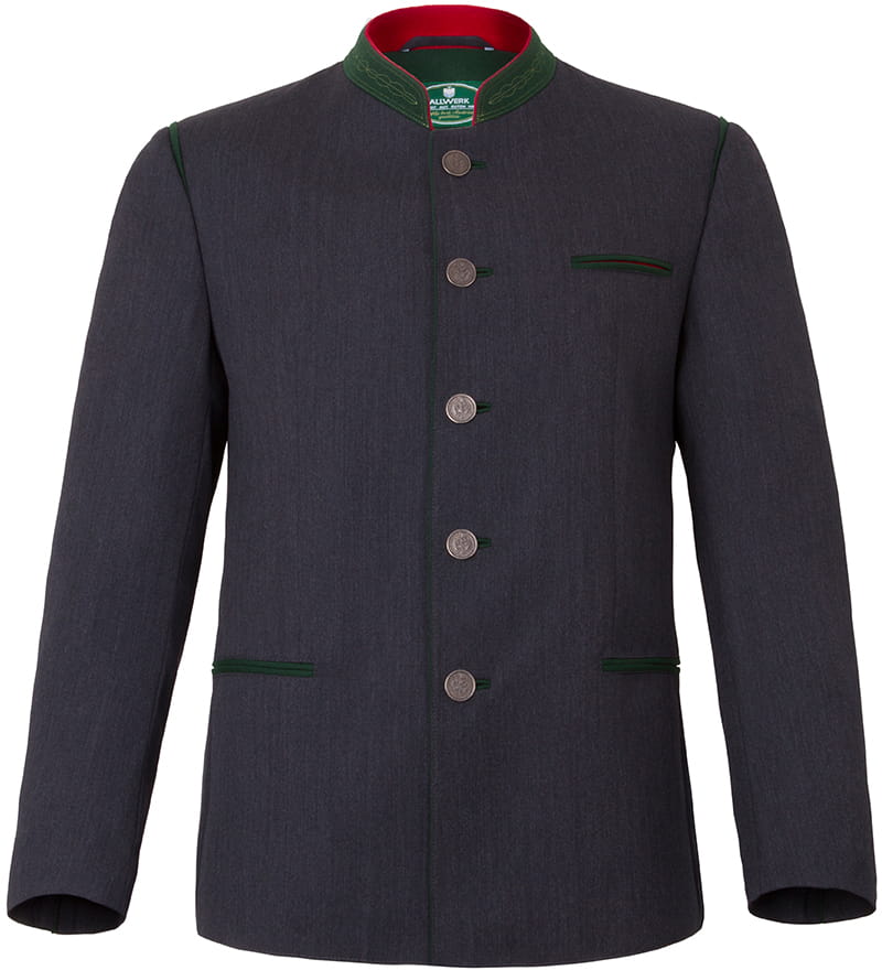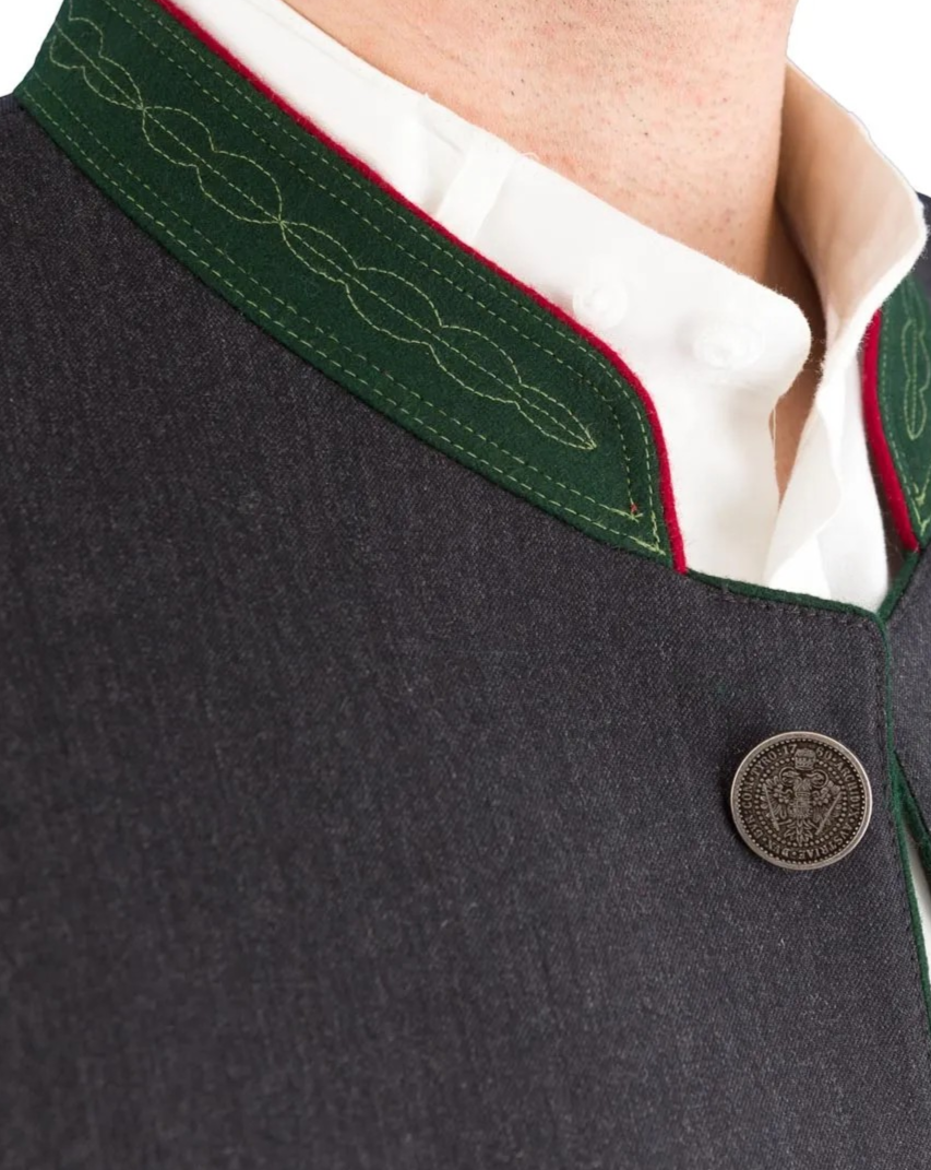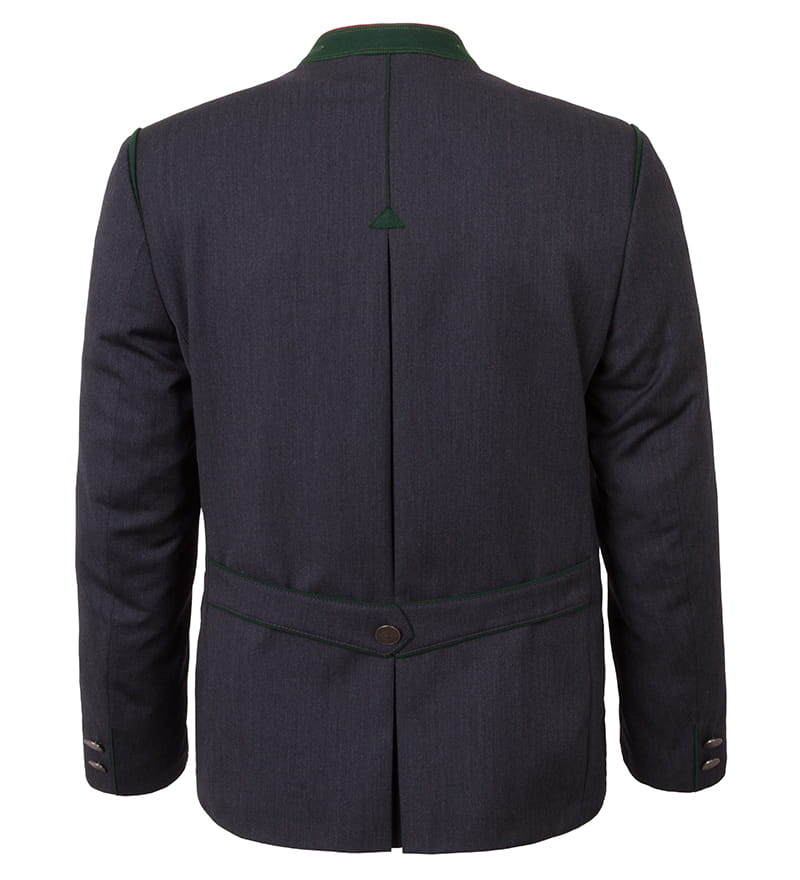 Charcoal grey suit-weight virgin wool with cast antique silver metal buttons, green stand-up collar with tonal embroidery detail and narrow red piping; green piping and trim on pockets and above the centre pleat as well as on the buttoned half-belt on the back of the jacket. Front buttonholes are also bound with the same green fabric.ย ย Shoulders are also trimmed with a narrow green flange above the sleeves.ย Full button front features cast metal buttons, which are also used on the sleeves.ย Fully lined with a shot red/green acetate, with two interior chest pockets.