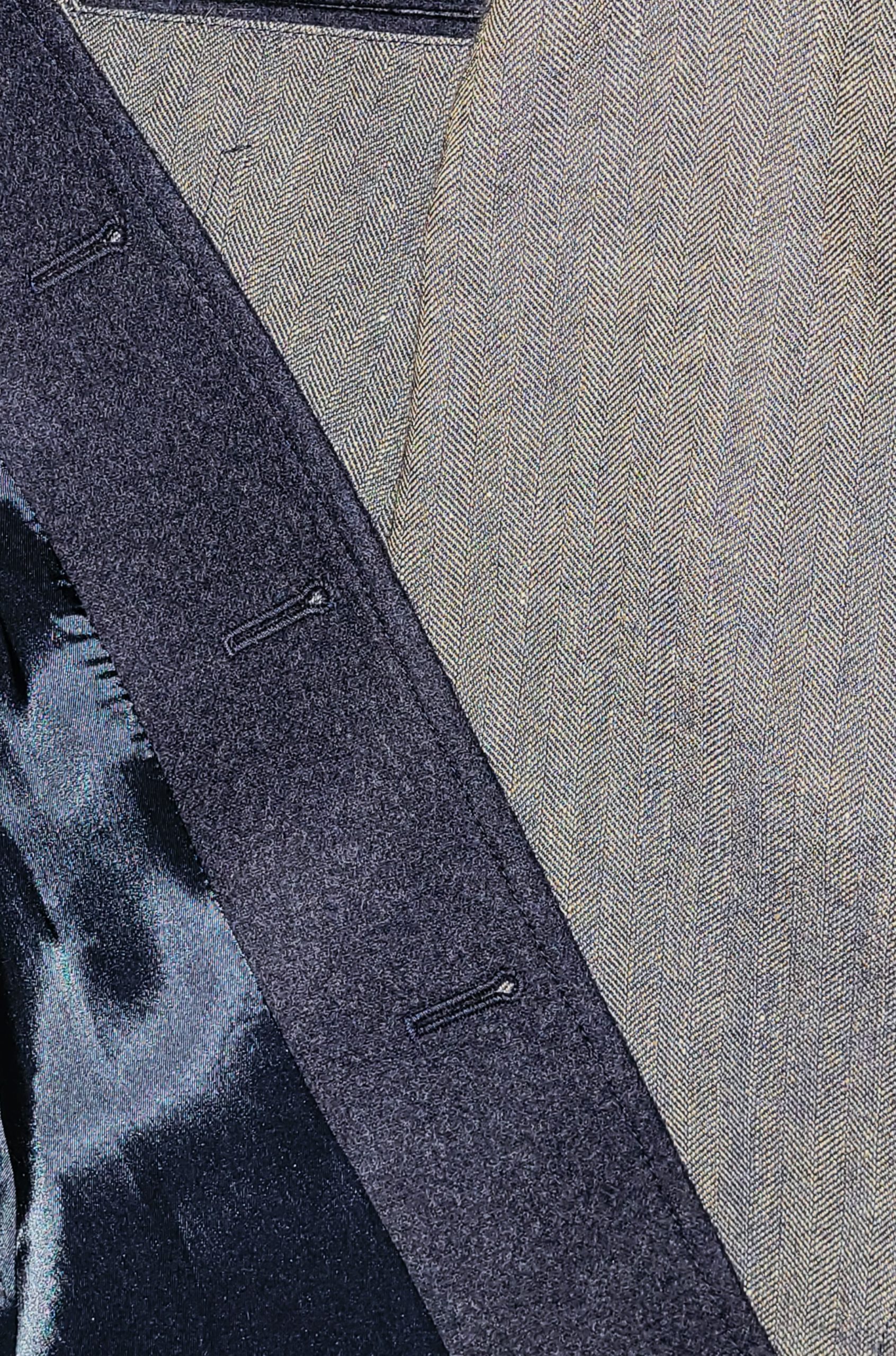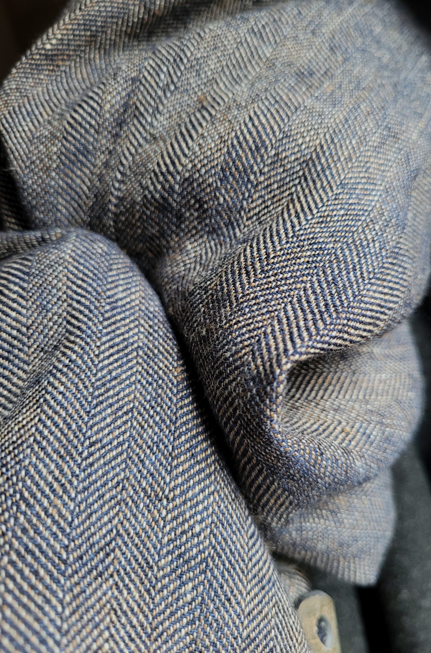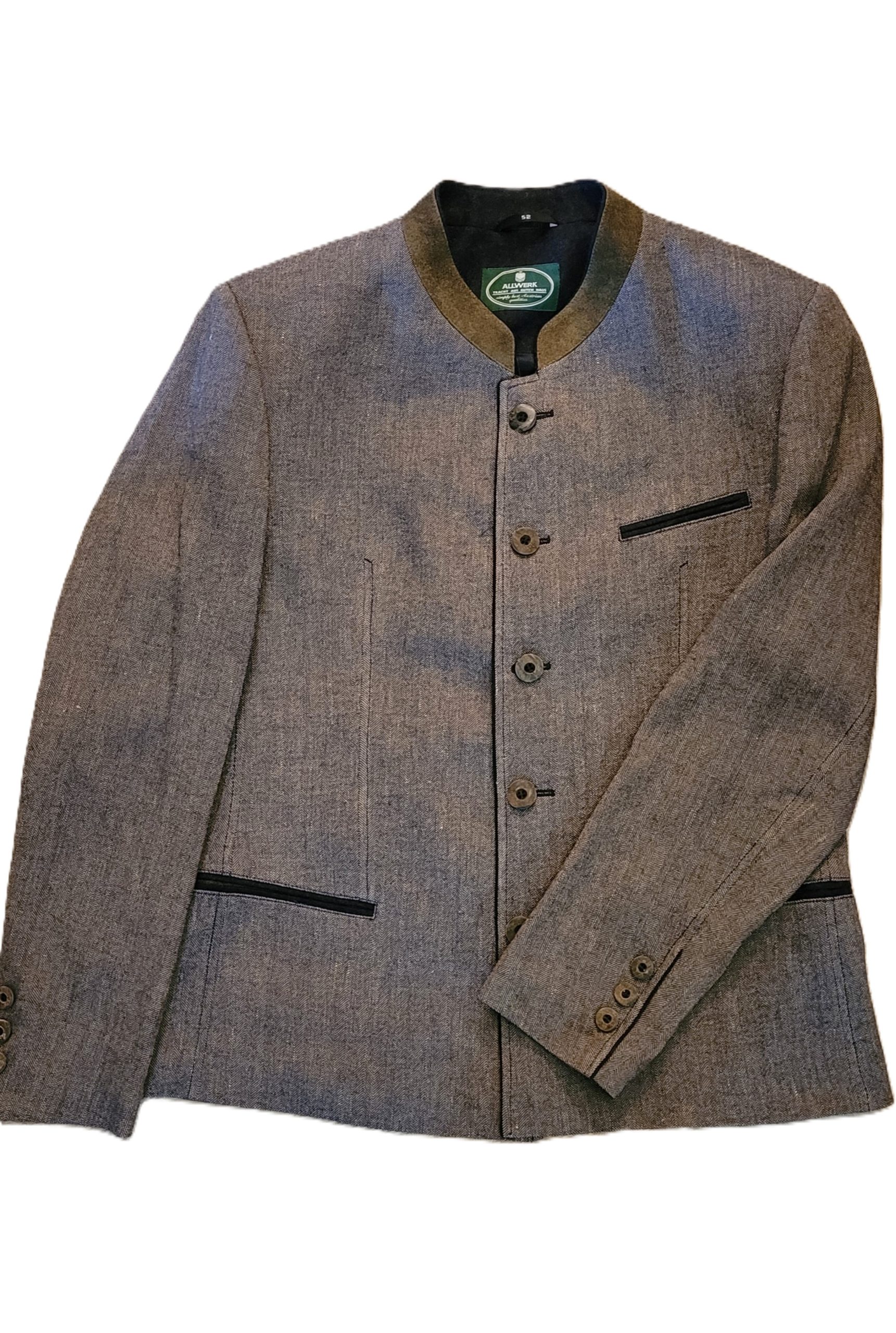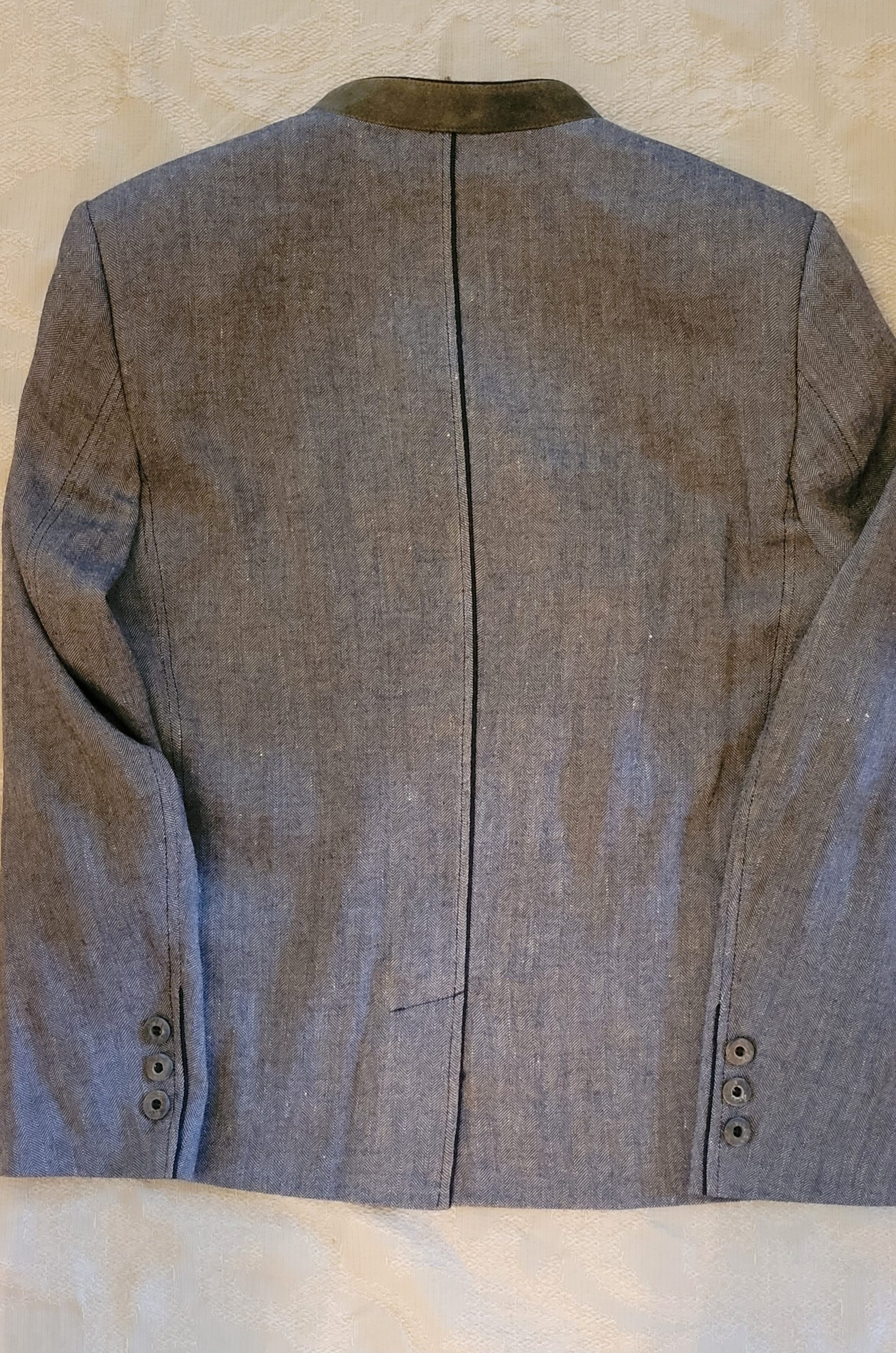 Great linen blend jacket in taupe and navy, with the appearance of fine herringbone tweed.ย Traditional stand up collar in taupe suede; navy loden wool is used for the inner front facings, piping accents and binding on the slash pockets. Dyed bone buttons up the front and at the cuffs.ย ย Fully lined in navy acetate, with two inner chest pockets – one with button closure.ย Blend of viscose, linen and wool for great texture and comfort.ย ย Looks great with lederhosen,ย dress pants or your best dark denim jeans.