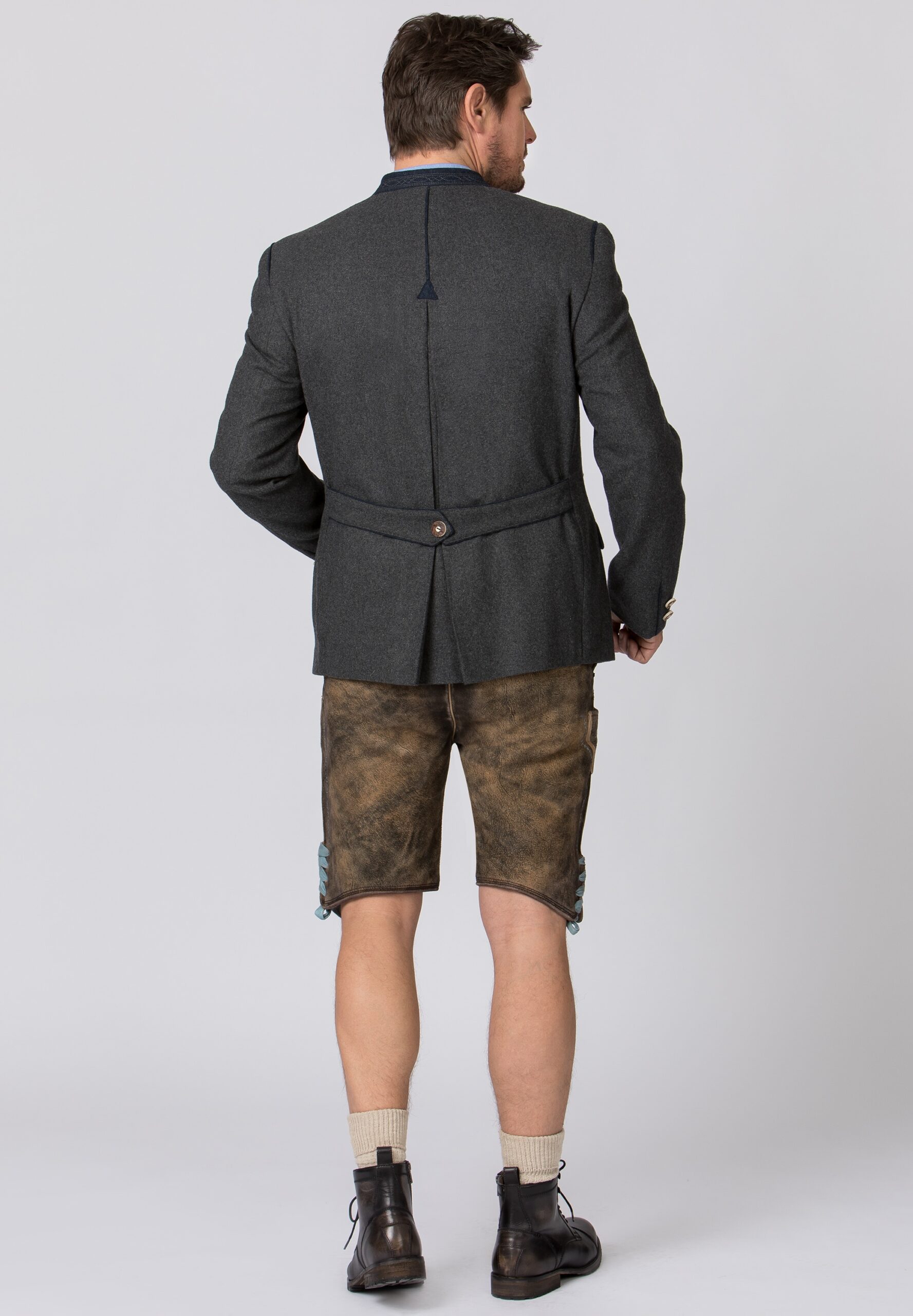 Classic men’s trachten jacket in mid-weight grey wool.ย  Traditional embroidered stand-up collar along with the piping at shoulders and pockets is medium blue.ย  Front buttons and those at the cuffs of the sleeves are made from deer antlers (naturally shed).ย  Back features 3/4 length center pleat with piping and applique, and half-belt with horn button.ย  ย Fully lined in acetate.