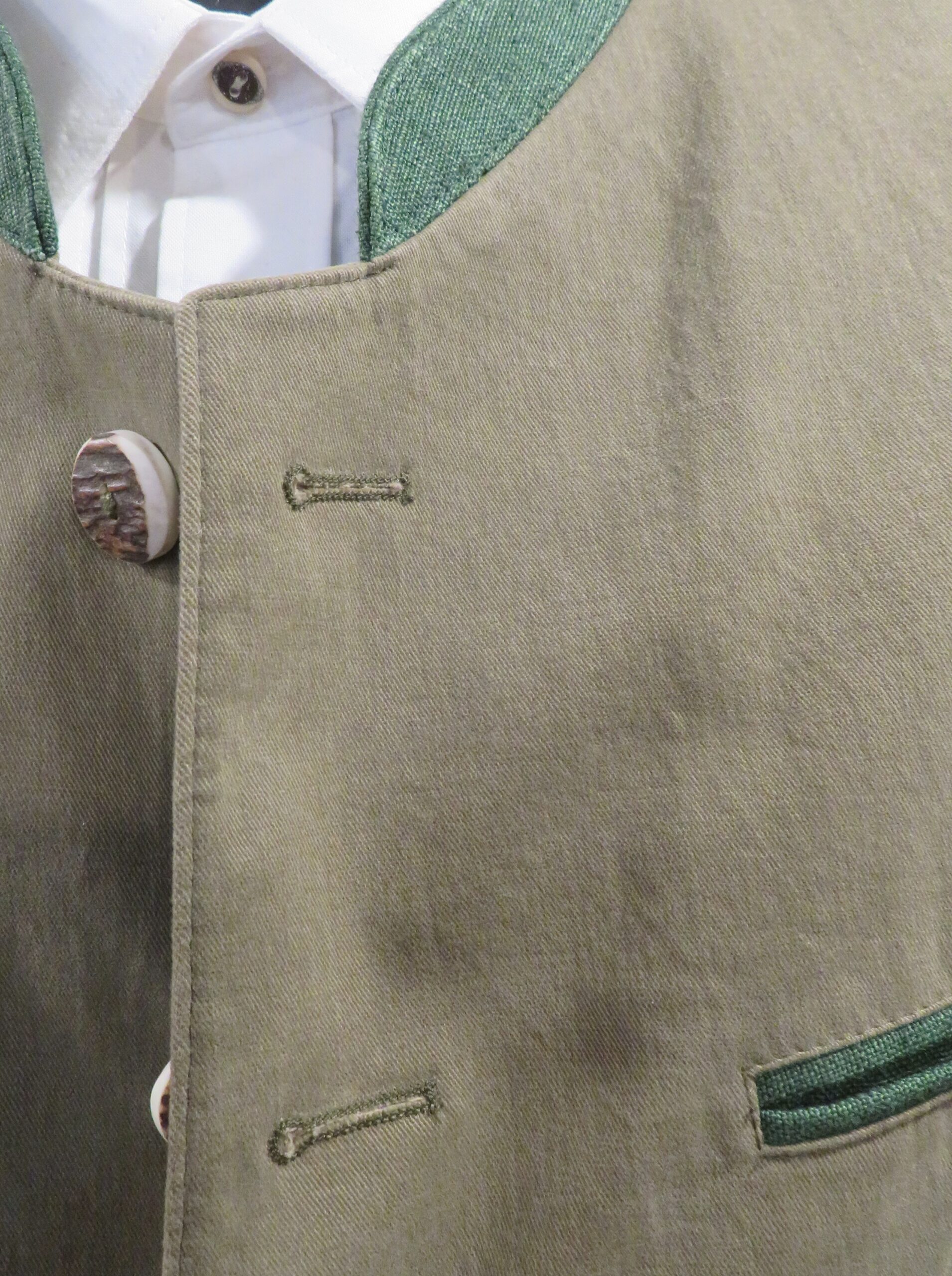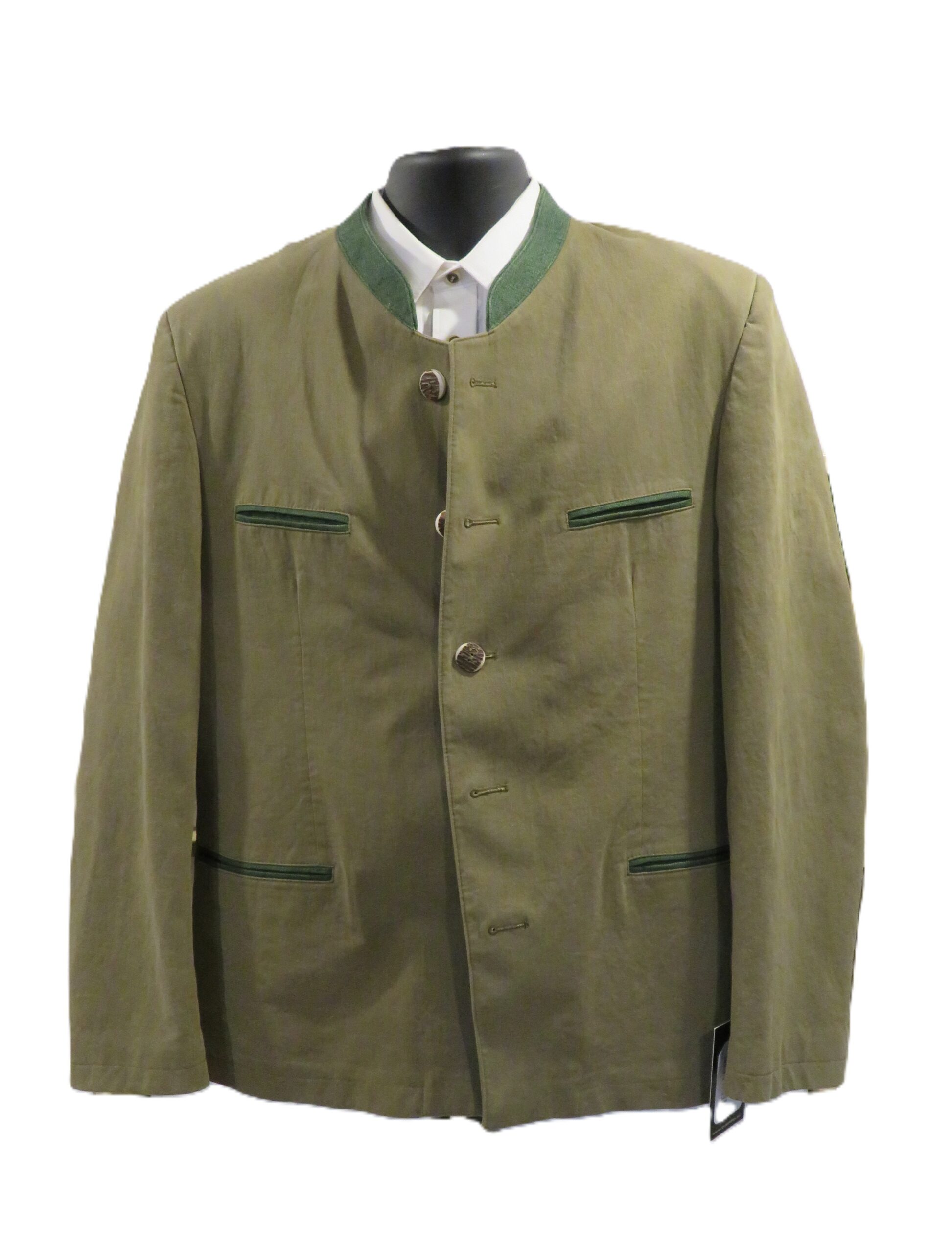 Men’s Trachten Janker made by premium manufacturer Lodenfrey.ย Available in men’s size 52 only (US 42).ย Olive green with green linen trim.ย Half-lined.ย Luxurious brushed cotton twill.ย Horn buttons.ย Half-belt back with horn button.