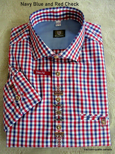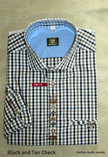 Fab shirt that combines modern collar shape with traditional elements like front embroidery detail and horn buttons. Sleeves may be worn long, or rolled up and secured above the elbow with decorative button tabs featuring both embroidery and metal edelweiss embellishment.
