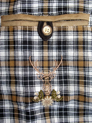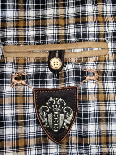 Traditional embroidered and appliqued details on the front pockets of this black, brown and white plaid shirt make it perfect with pants, jeans or belted lederhosen. Convertible sleeves can be worn long or rolled up above the elbow and buttoned in place using the decorative tabs.