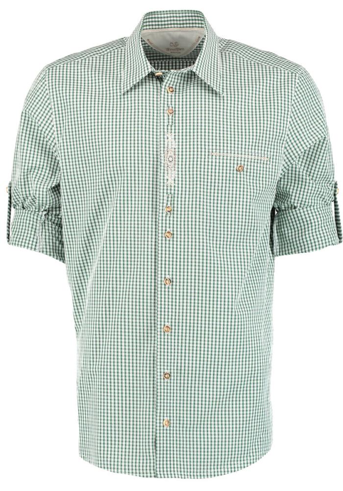 Trachten shirt in small scale deep green and white check features neutral embroidery and pewter finish metal accent on upper front centre placket, and subtle neutral embroidery embellishing the front chest pocket and the sleeve tabs that can be used to secure the sleeves above the elbow when rolled up as seen in secondary photo.ย ย Regular fit; suitable for all body types.