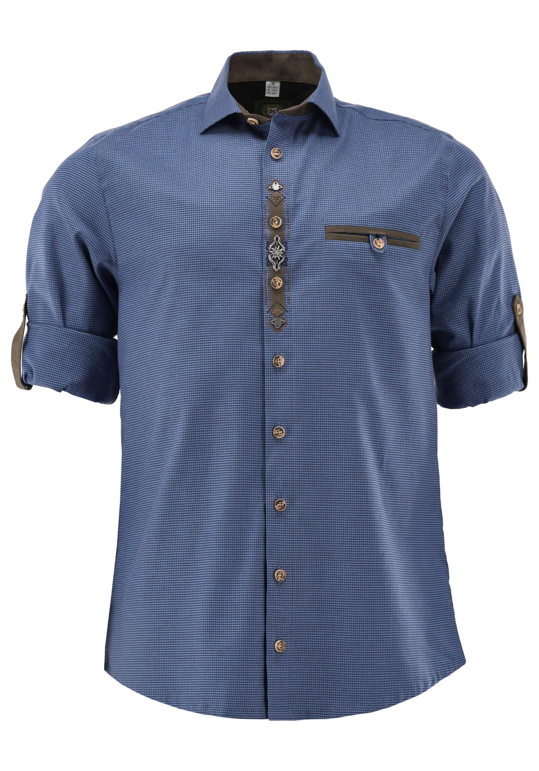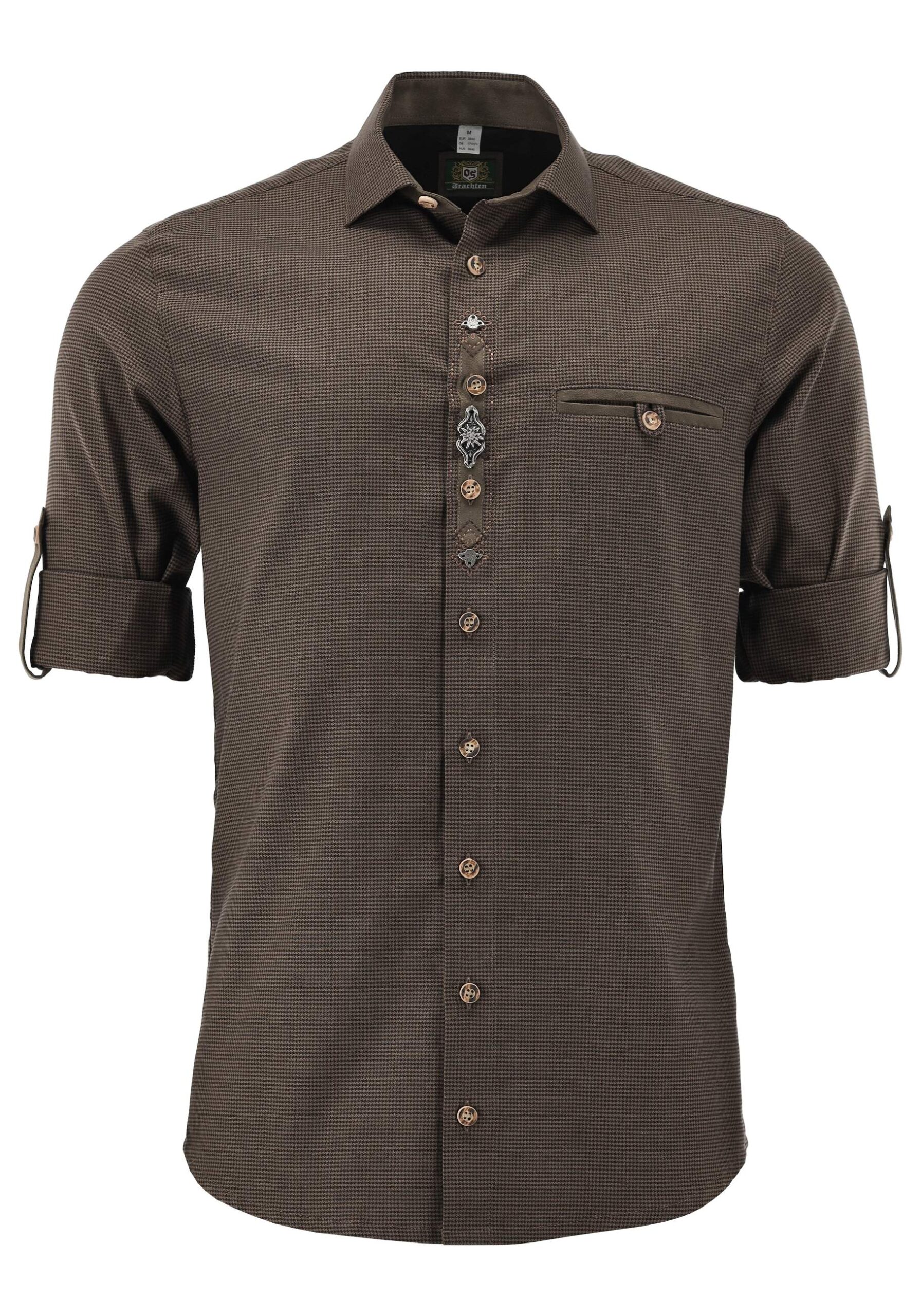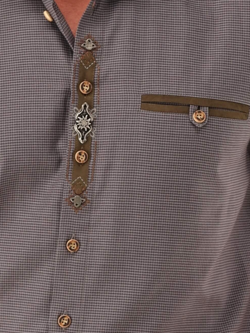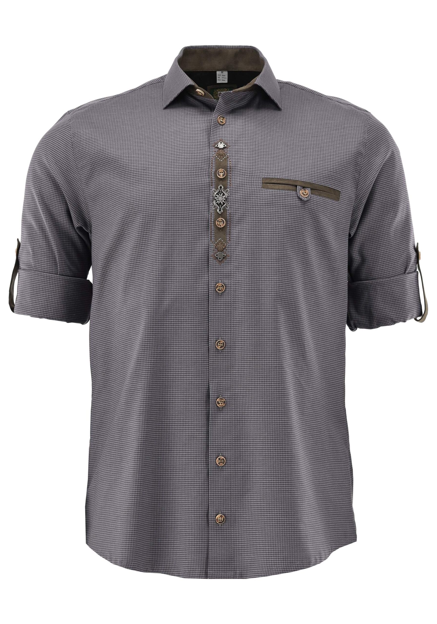 Men’s Trachten Shirt Micro Check with Placket Trim & Convertible Sleeve Grey Regular Fit