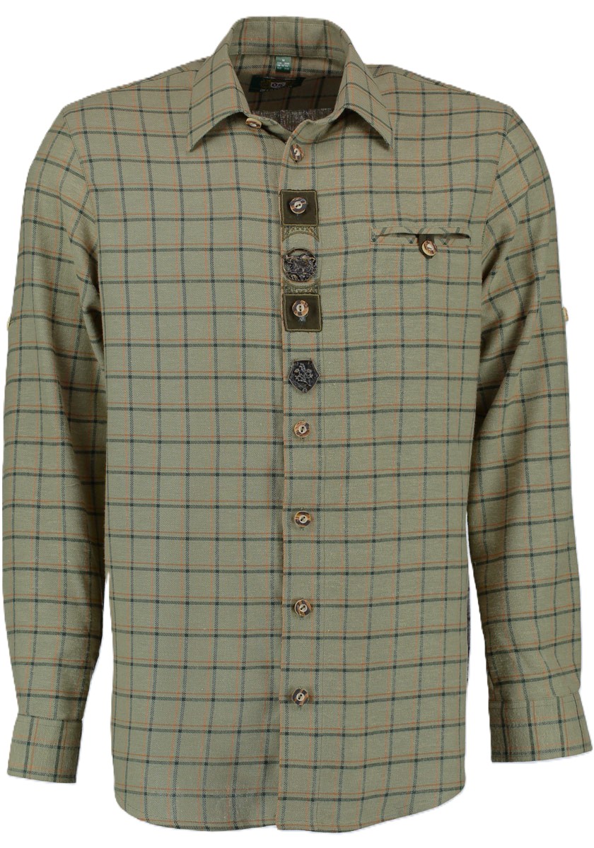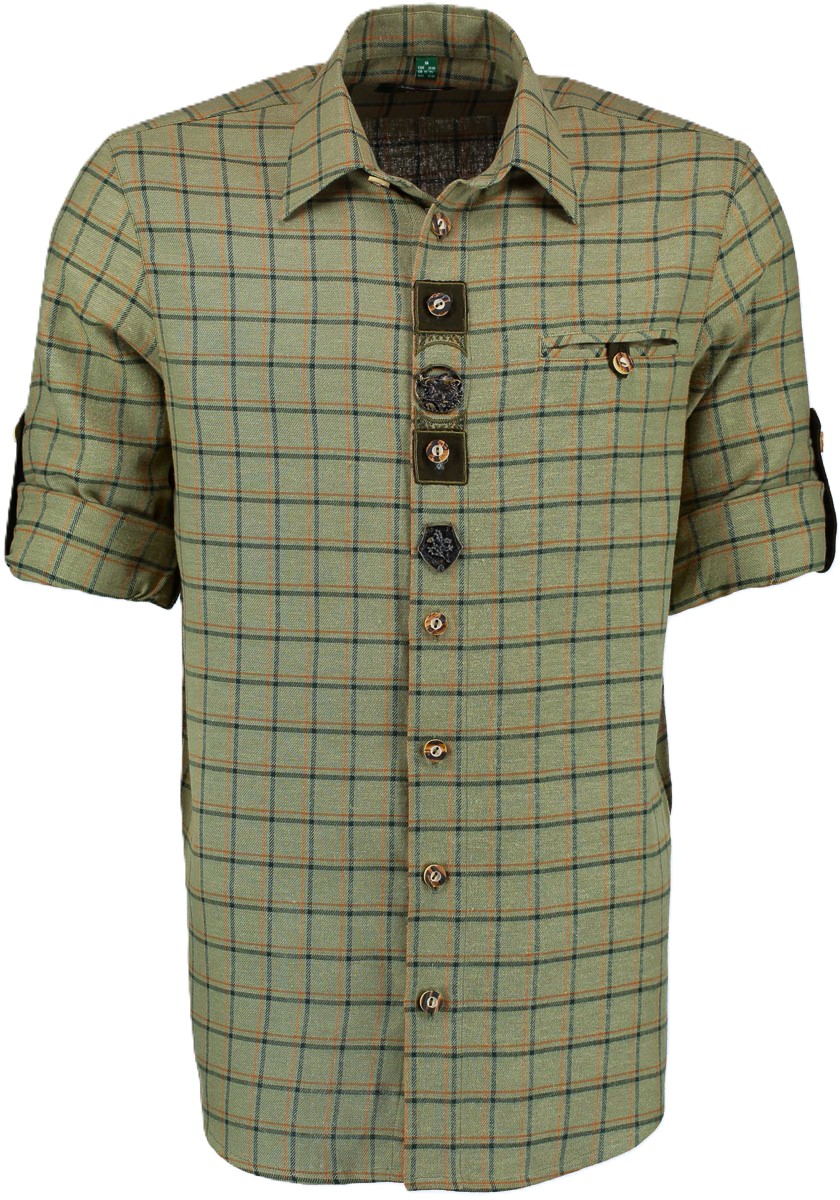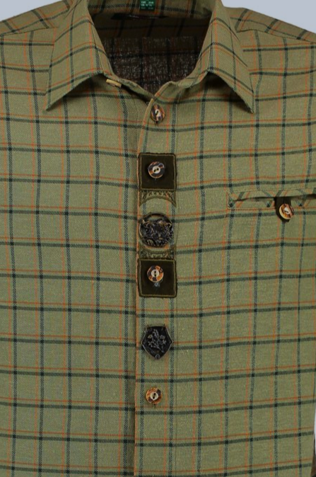 Soft and comfy 100% cotton shirt in a soft olive green open plaid, with black and narrow orange stripe.ย Front placket has horn buttons with applique and embroidery trim and features a central metal applique of a wild boar head.ย Sleeves convert simply by rolling/folding them up and securing with the button tabs.ย Regular fit.