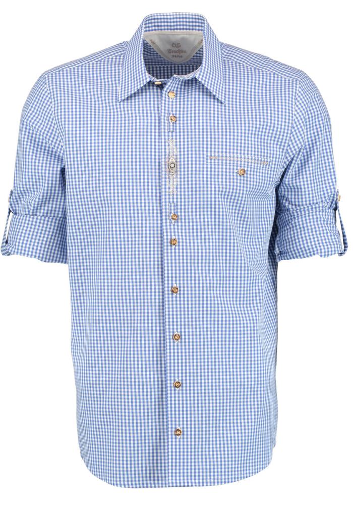 Trachten shirt in small scale royal blue and white check features neutral embroidery and pewter finish metal accent on upper front centre placket, and subtle neutral embroidery embellishing the front chest pocket and the sleeve tabs that can be used to secure the sleeves above the elbow when rolled up as seen in secondary photo.ย  ย  Regular fit; suitable for all body types.