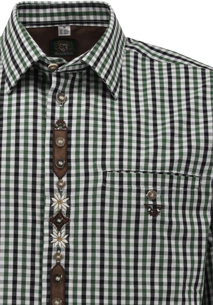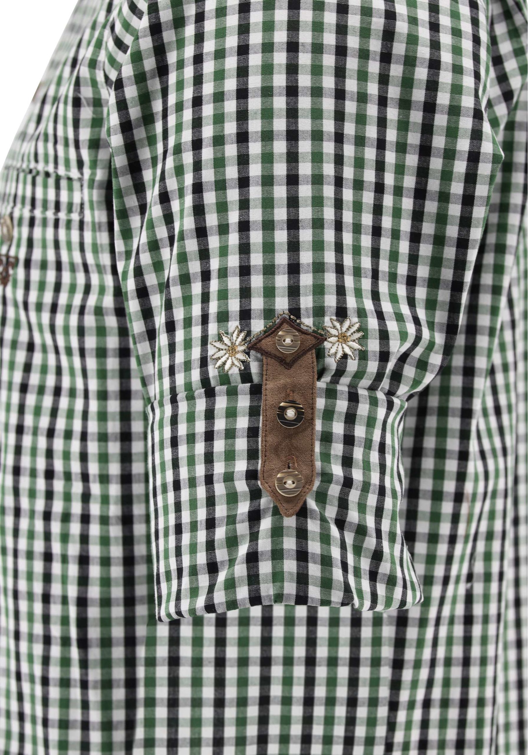 This traditional shirt has front placket embroidery and applique detail.ย Long sleeves convert to above the elbow by rolling and fastening with decorative contrast fabric tab.ย Faux horn buttons on front, cuffs and tabs.