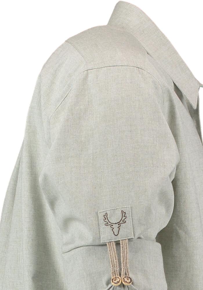 Sage green cotton shirt with brown embroidery and edelweiss applique detail on upper front placket.ย Horn buttons on front, cuffs and on the button tabs that hold the sleeves in place when they are rolled up above the elbow.ย Comfort fit – a little roomier than regular fit.