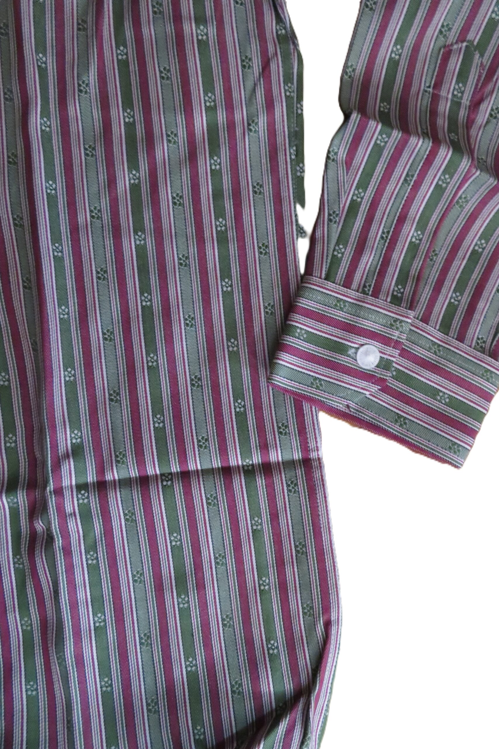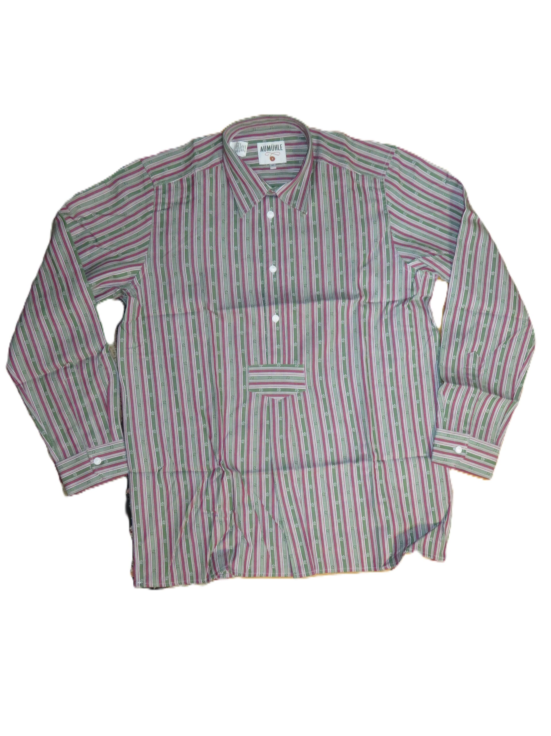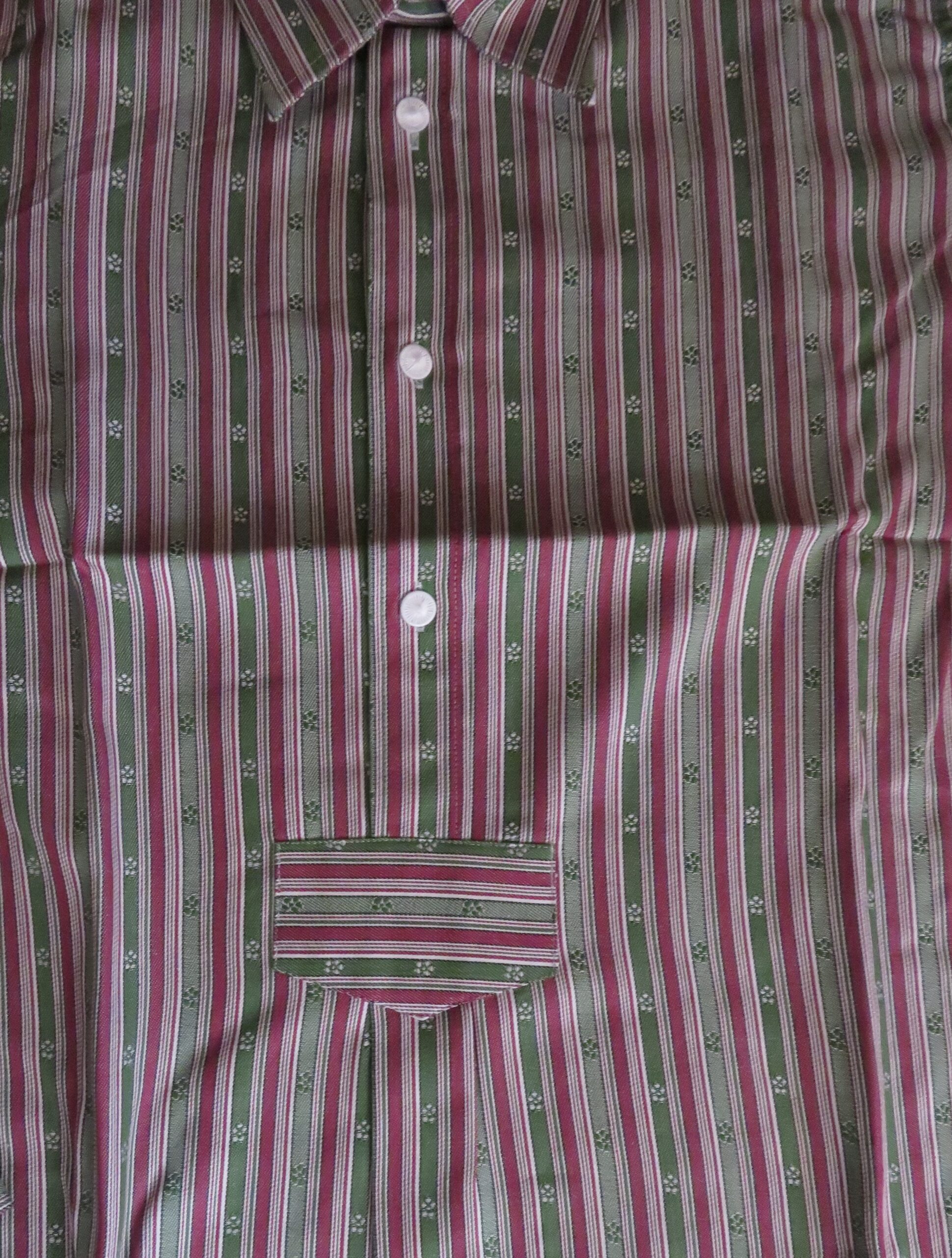 Premium quality jacquard men’s traditional “Pfoad” style pullover trachten shirt.ย Magenta/green stripes.ย 100% cotton woven jacquard.ย Fabric made in Austria.ย Imported from Aumuehle in Germany.ย Adjustable collar strap.ย Perfect look with lederhose.ย Available in size 42 or large (16 1/2 neck) only.